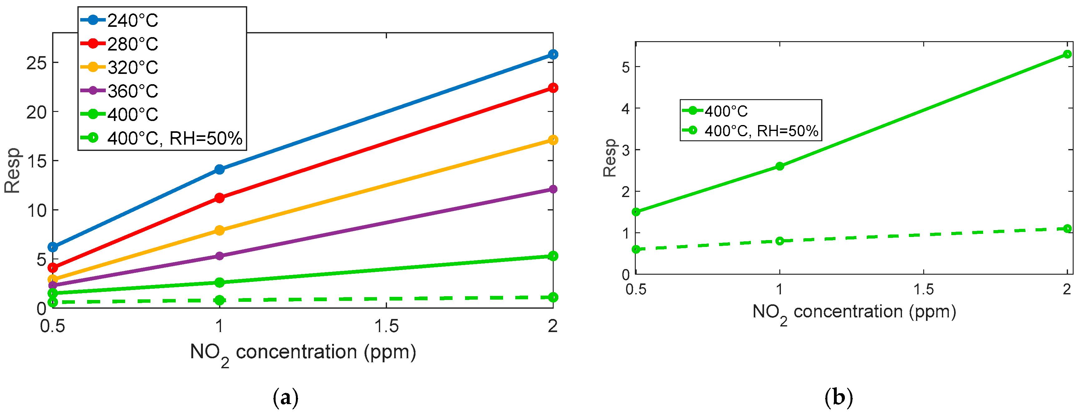 In summary, operating the sensor at temperatures above 360 °C and under relative humidity levels exceeding 20% is appropriate and effective for the intended application.