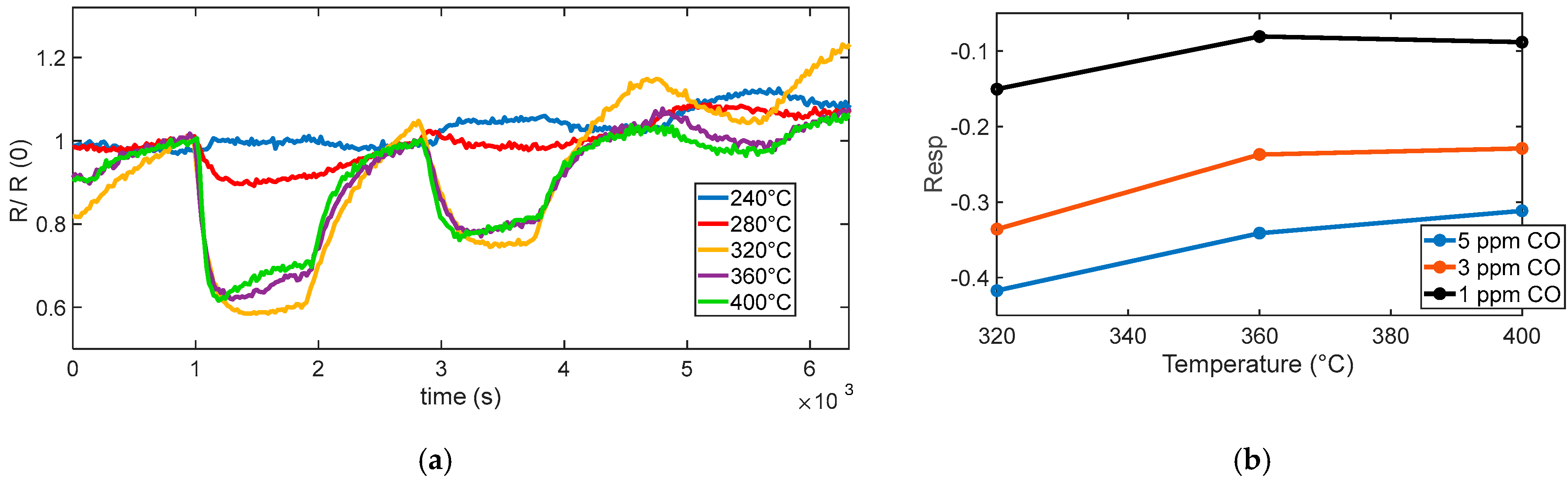 Figure 12a shows the measured sensor response to various CO concentrations (5 ppm, 3 ppm, and 1 ppm) at different operating temperatures. At low temperatures (below 300 °C in our tests), the sensor exhibited a slow or negligible response, which indicates that the oxygen species are weakly bound and predominantly present in molecular form. A noticeable and consistent response begins to emerge at 320 °C, which corresponds to the activation of chemisorbed oxygen species, primarily O
