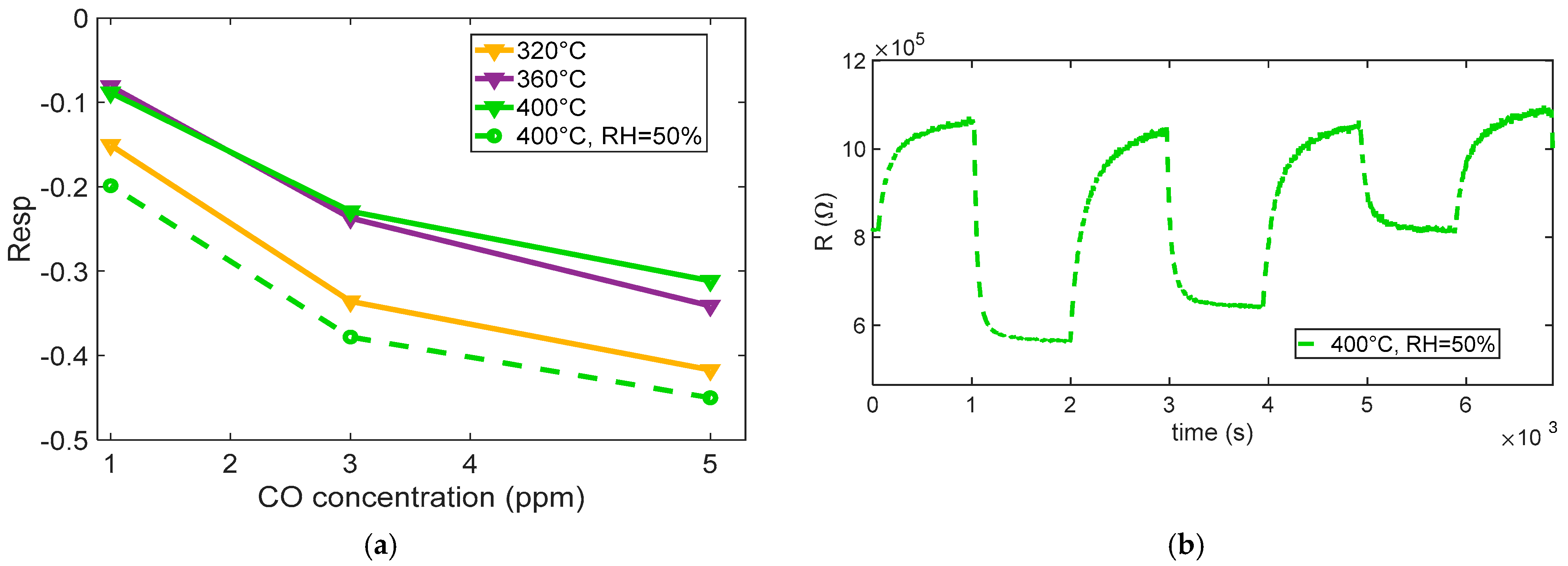 Figure 13 summarizes the measured response to the different CO concentrations. The results indicate that, in the presence of humidity, water vapor can significantly influence the CO sensing mechanism on SnO