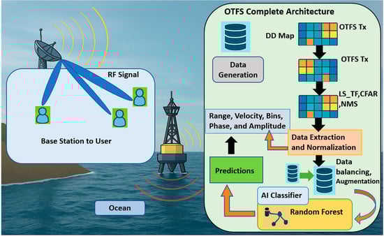 The monostatic radar operates in the X-band at a carrier frequency of f c = 9.4  GHz, corresponding to a wavelength of λ r = c / f c 0.032  m. The total system bandwidth and sampling rate are both B = F s = 200  MHz, enabling fine delay resolution. The OTFS lattice is defined as Z M × Z N with M = 1024 delay bins and N = 4096 Doppler/time bins. These parameters yield a subcarrier spacing of Δ f = B / M = 195.3125 kHz and an OTFS symbol duration T sym = 1 / Δ f = 5.12 μ s . The total frame duration is T frame = N × T sym = 0.02097  s, producing a Doppler spacing of Δ ν = 1 / T frame = 47.68  Hz. The resulting delay resolution is Δ τ = 1 / F s = 5  ns (equivalent to 0.75 m in range), and the velocity resolution is Δ v = ( λ r / 2 ) Δ ν 0.76  m/s. These values establish a high-fidelity sensing grid well-suited for maritime scenarios. All the simulations used the same lattice and these parameters. The full architecture of the project is shown in Figure 6, Table 1 summarizes the principal sea-state parameters for multiple frames.
