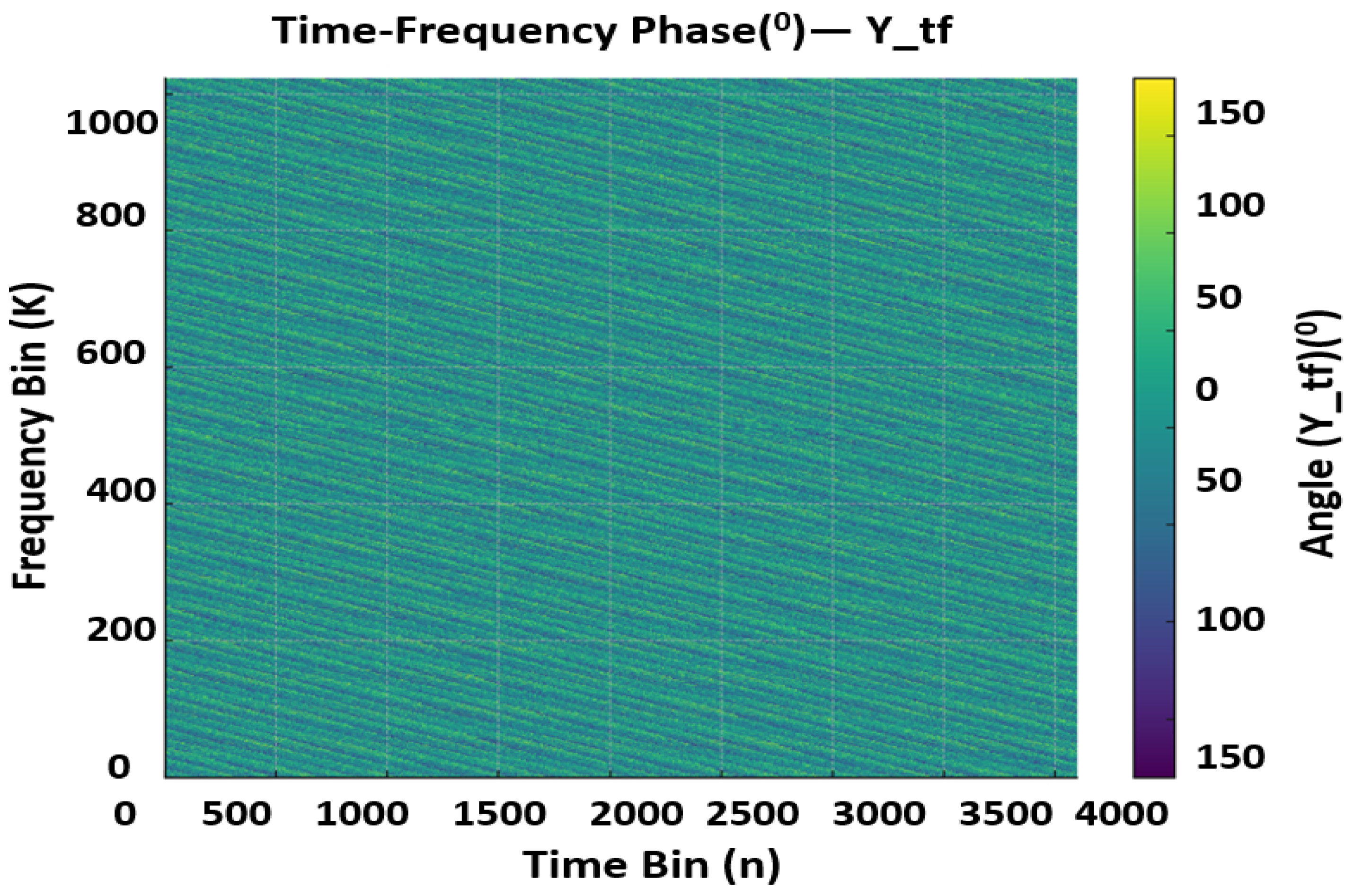 Equation (2) inverts (1) up to channel distortion and noise, re-concentrating target energy into sparse neighborhoods in the DD grid. Using unitary transforms ensures energy consistency between TF and DD, enabling quantitative comparisons of noise floors and pilot SNR. Figure 3 and Figure 4 presents the receive TF magnitude (dB) and the receive TF phase (degrees) under additive noise and fractional delay/Doppler. Relative to the transmit reference, pilot tones are attenuated and phase-rotated by the channel; their SNR determines the reliability of per-tone channel estimates and the interpolation accuracy in data regions. The observed noise pedestal and any slight spectral tilt reflect the configured SNR and front-end windowing; these factors directly influence equalizer choice in the communication stack and detection thresholds in the sensing stack.