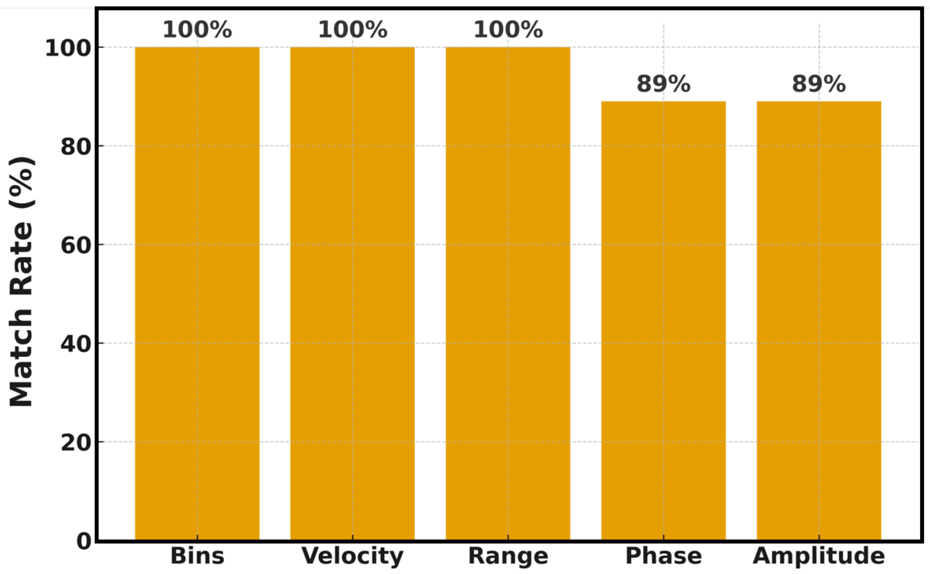 The bars represent the proportion of correctly matched delay–Doppler bins, physical ranges, and velocities relative to their ground-truth values. The figure shows that the bin, range, and velocity parameters achieve an exact 100 % correspondence, indicating that the lattice indexing and physical mapping are perfectly aligned with the ground-truth metadata. In contrast, the amplitude and phase exhibit an 89 % match rate—an expected deviation due to residual channel noise and fractional Doppler leakage. This confirms that while structural localization (in terms of range and velocity) is entirely reliable, fine-scale amplitude and phase recovery are limited by the inherent SNR of the received signal. The figure validates the deterministic and physics-consistent nature of the extraction algorithm across all evaluated frames. Range and radial velocity are derived from integer ( m , n ) bins (or their continuous refinements), which are robust to global complex rotations and mild leakage; hence, their perfect agreement with ground truth. In contrast, absolute complex amplitude and phase are sensitive to a per-frame complex gain (CPE), fractional-bin leakage under the chosen window, and multipath superposition. Our audit, therefore, reports amplitude/phase as secondary diagnostics with strict tolerances, while range/velocity remains the primary physics-anchored Key Performance Indicator (KPIs).