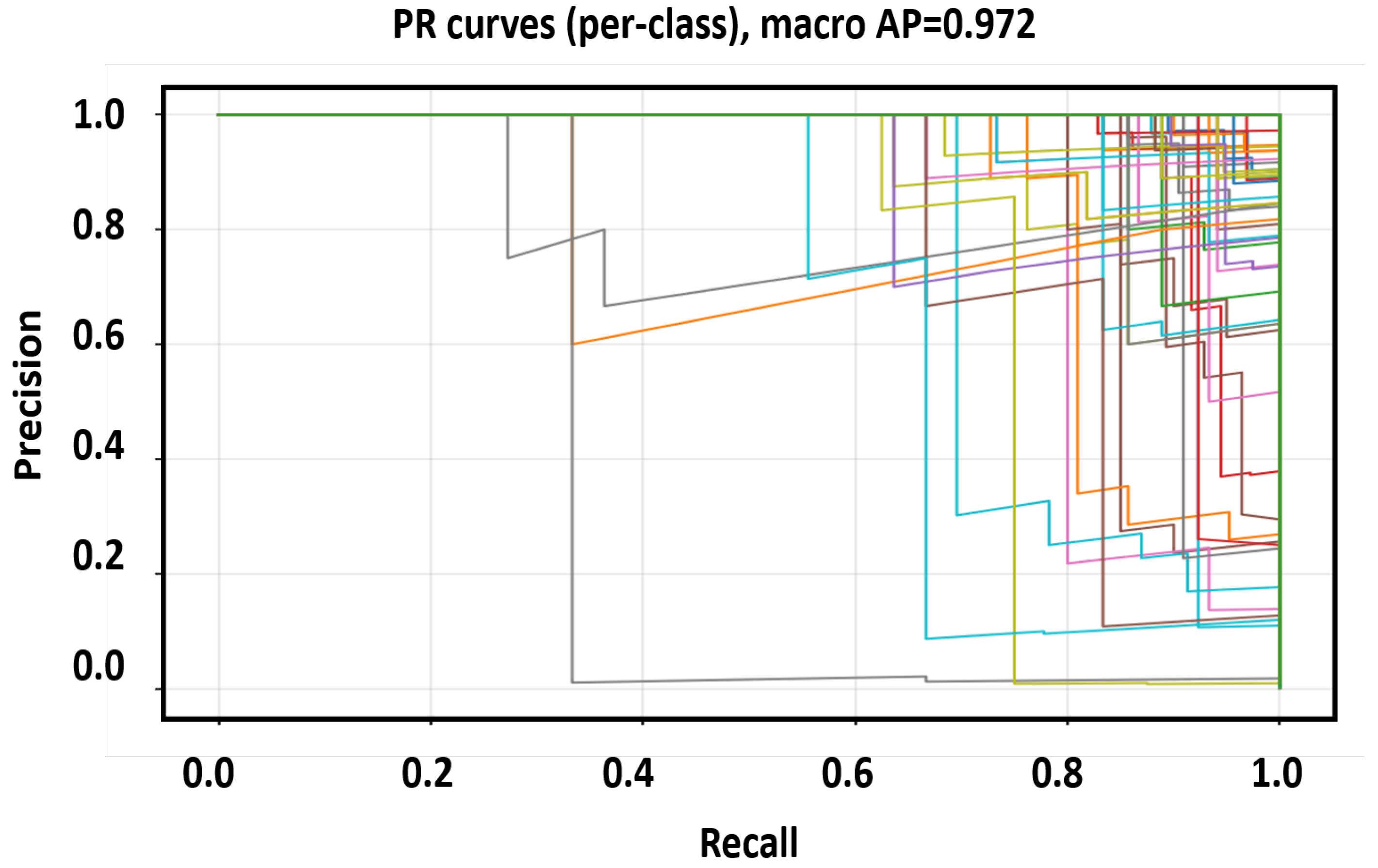 Figure 10 presents the multi-class Precision–Recall (PR) curves, where the macro Average Precision (AP) reaches 0.972 , confirming excellent ranking of positives above negatives even when the curves exhibit small oscillations due to finite validation size. The high AP demonstrates that the classifier maintains robust ordering of correct classes across thresholds, validating that normalization (RMS, reference phase) and balanced sampling reduce bias from SNR variations.