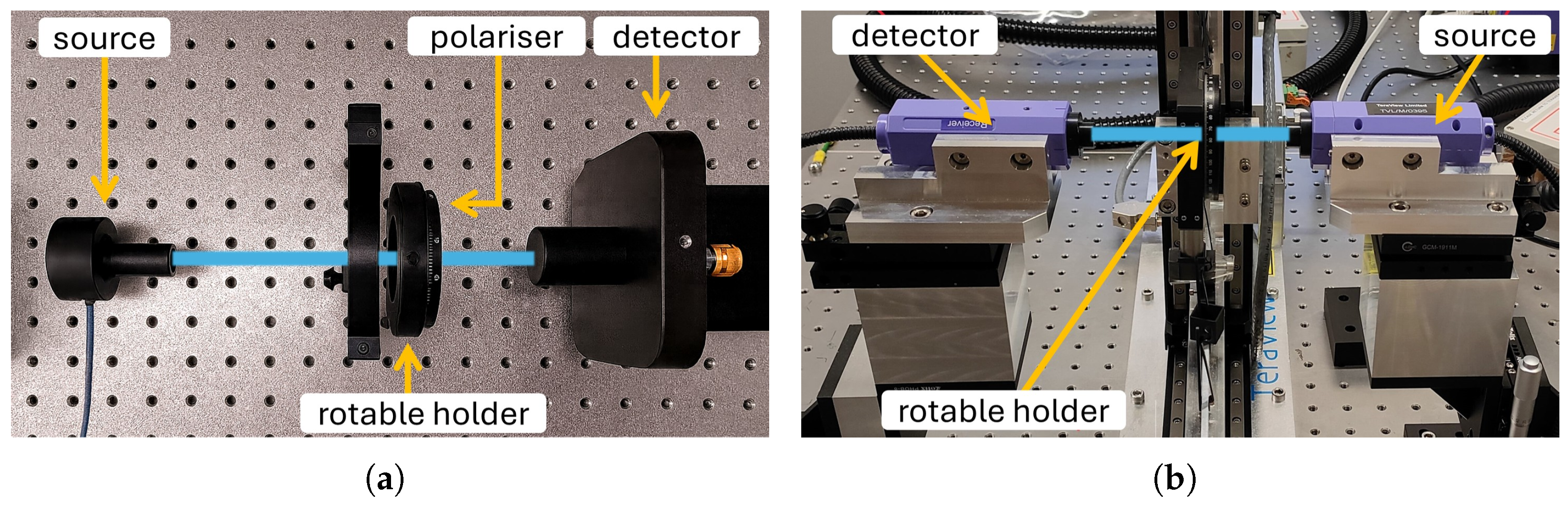 Two experimental setups were assembled to thoroughly investigate the angular and spectral aspects of the polarisers’ performance. The photographs of the setups with the description of their elements are presented in