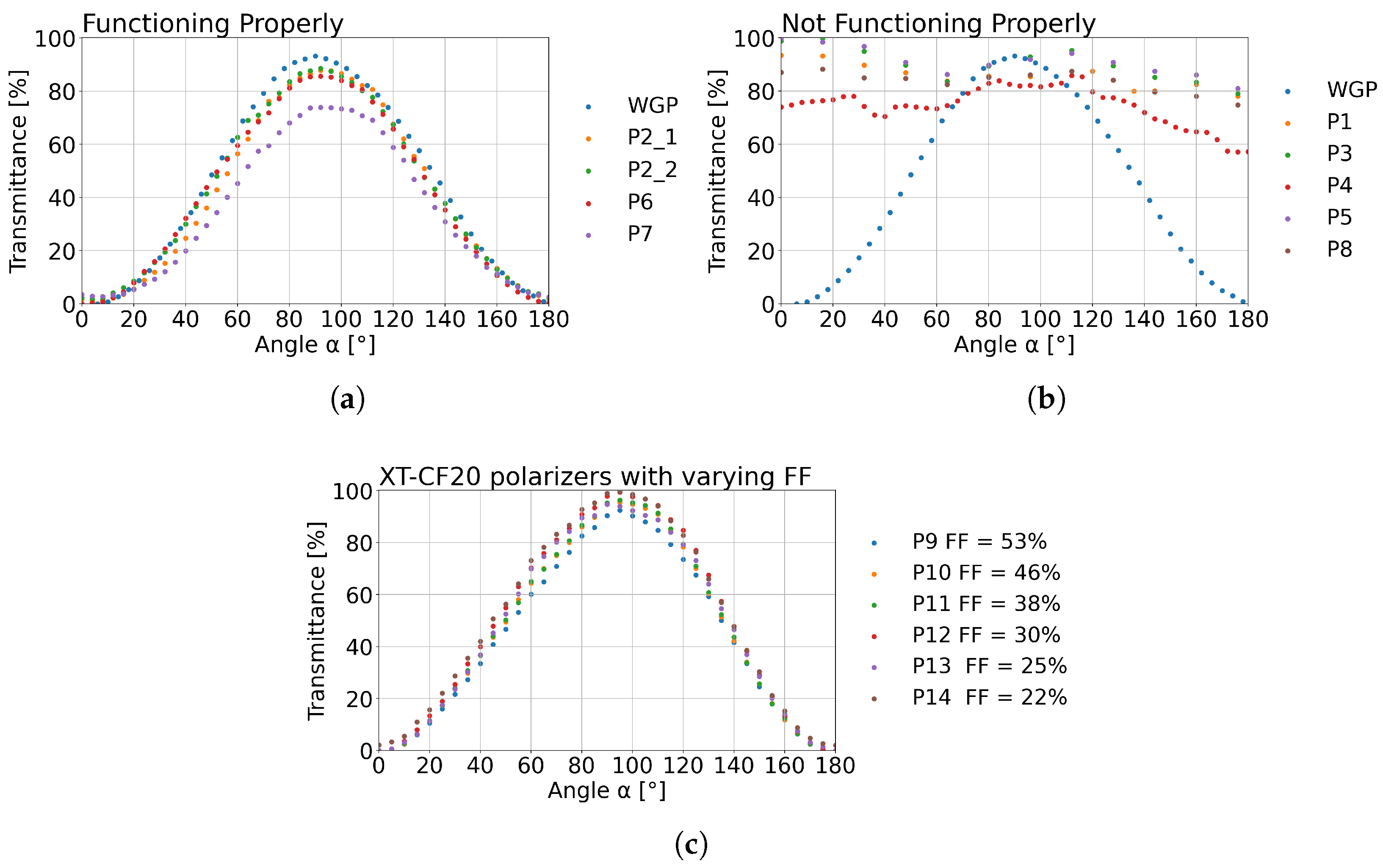 41]. The wire-grid polariser (WGP) used as a reference in this research has a periodic structure consisting of thin conductive wires. Such a grid, consisting of alternating dielectric (surrounding—air) and conductive (wires—metal) areas, must have a period matched to the design wavelength at which it is intended to operate. Electromagnetic (EM) waves polarised perpendicular to the wires interact with grid lines whose wire width is insufficient to excite electron motion. It results in a partial reflection of the energy, and the remaining energy passes through the surface. Such constructed polarisers behave like a dielectric. On the other hand, the propagating EM waves polarised parallel to the wires cause the movement of electrons in that direction. Thus, the EM wave is reflected from the surface, and the polariser in this case behaves like a metallic surface, also causing a minimal loss of energy due to the heating of the wires [
