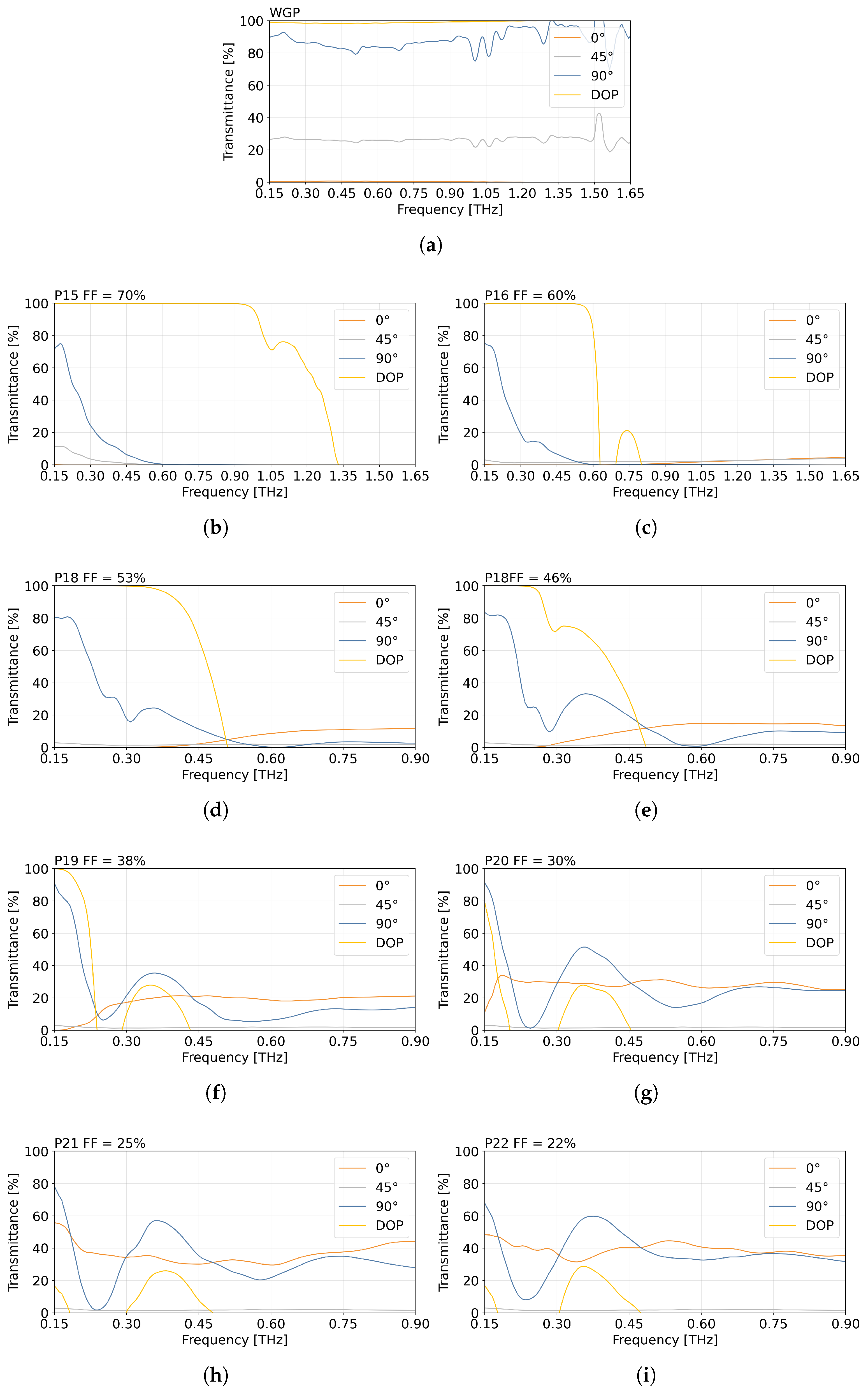 Normalised dependence of the degree of polarisation (DOP) and the transmittance at 0°, 45°, and 90° angles as a function of THz radiation frequency for (a) a commercial wire-grid polariser, and polarisers –, manufactured from XT-CF20 with the following FF values: (b) 70%, (c) 60%, (d) 53%, (e) 46%, (f) 38%, (g) 30%, (h) 25%, and (i) 22%.