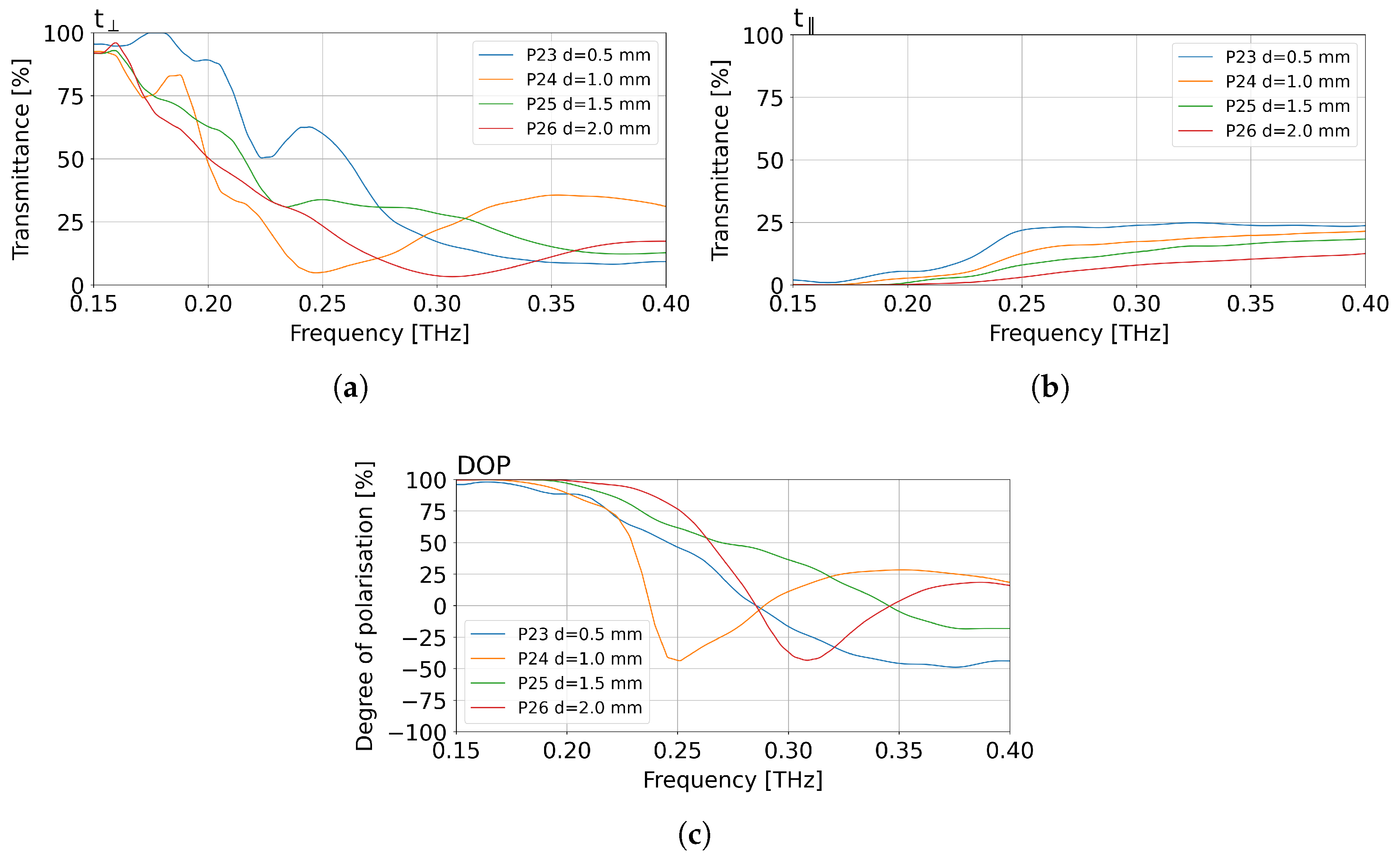Figure 5b, was used to analyse the performance of printed polarisers in a broader frequency spectrum, using the TeraView TeraPulse Lx THz-TDS system. It should be noted that the original parameters of the designed polarisers were optimised for the frequency of 95.7 GHz. Nevertheless, it can be expected that their operating frequency band is wider, which was intended to be verified in this part of the experiment.