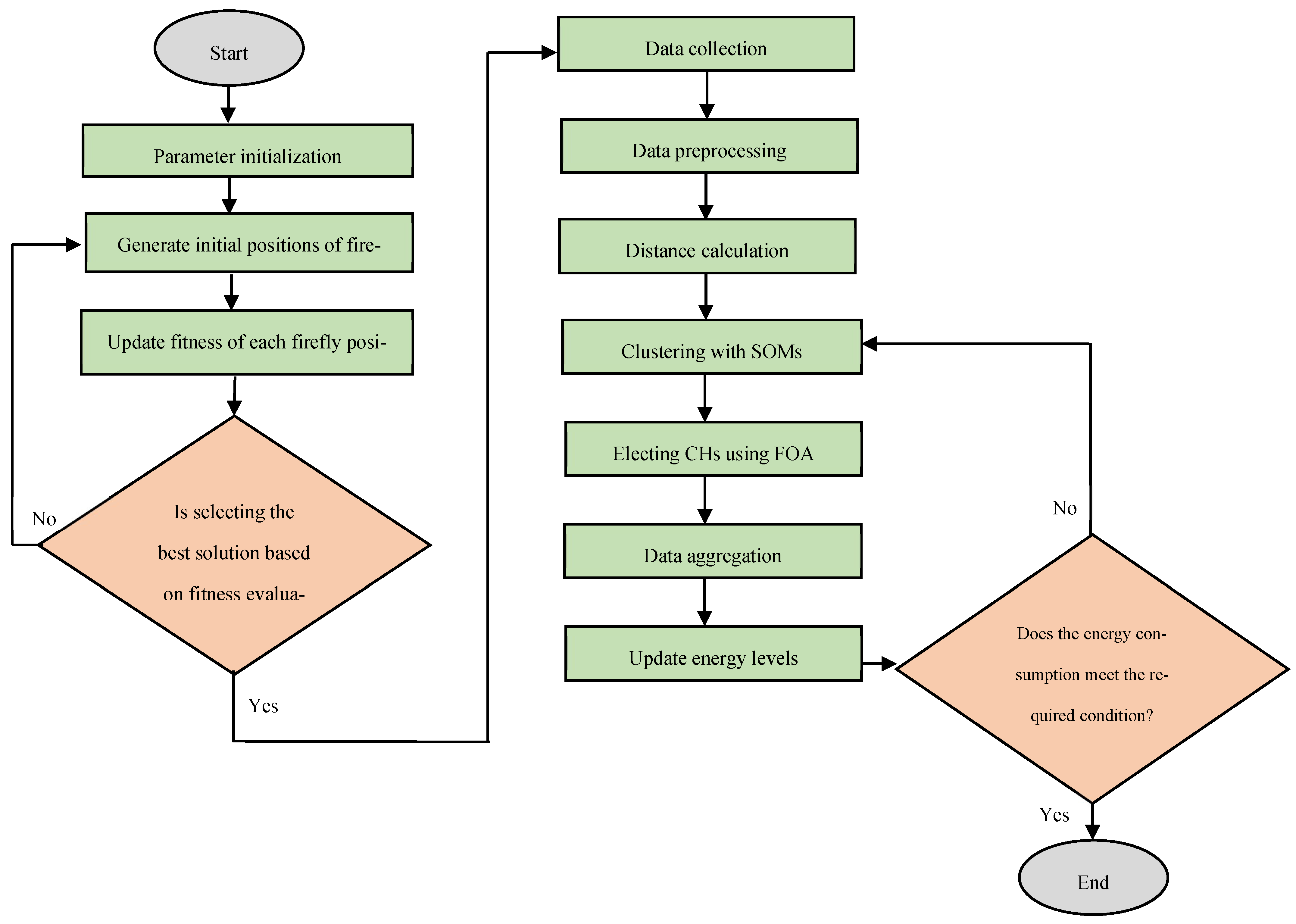 In this study, the FA is not presented as a novel or independent solution but rather as a practical heuristic within a hybrid FA–SOM framework designed for adaptive and energy-efficient data aggregation. The integration takes advantage of the FA’s simplicity and adaptability alongside SOM’s stable spatial clustering, overcoming each method’s limitations when used in isolation. This hybrid approach is particularly suitable for dynamic environments, such as IoT sensor networks, where network and data conditions frequently change. The resulting model offers self-regulation, topology-aware optimization, delivering reliable aggregation performance in complex, data-driven contexts.