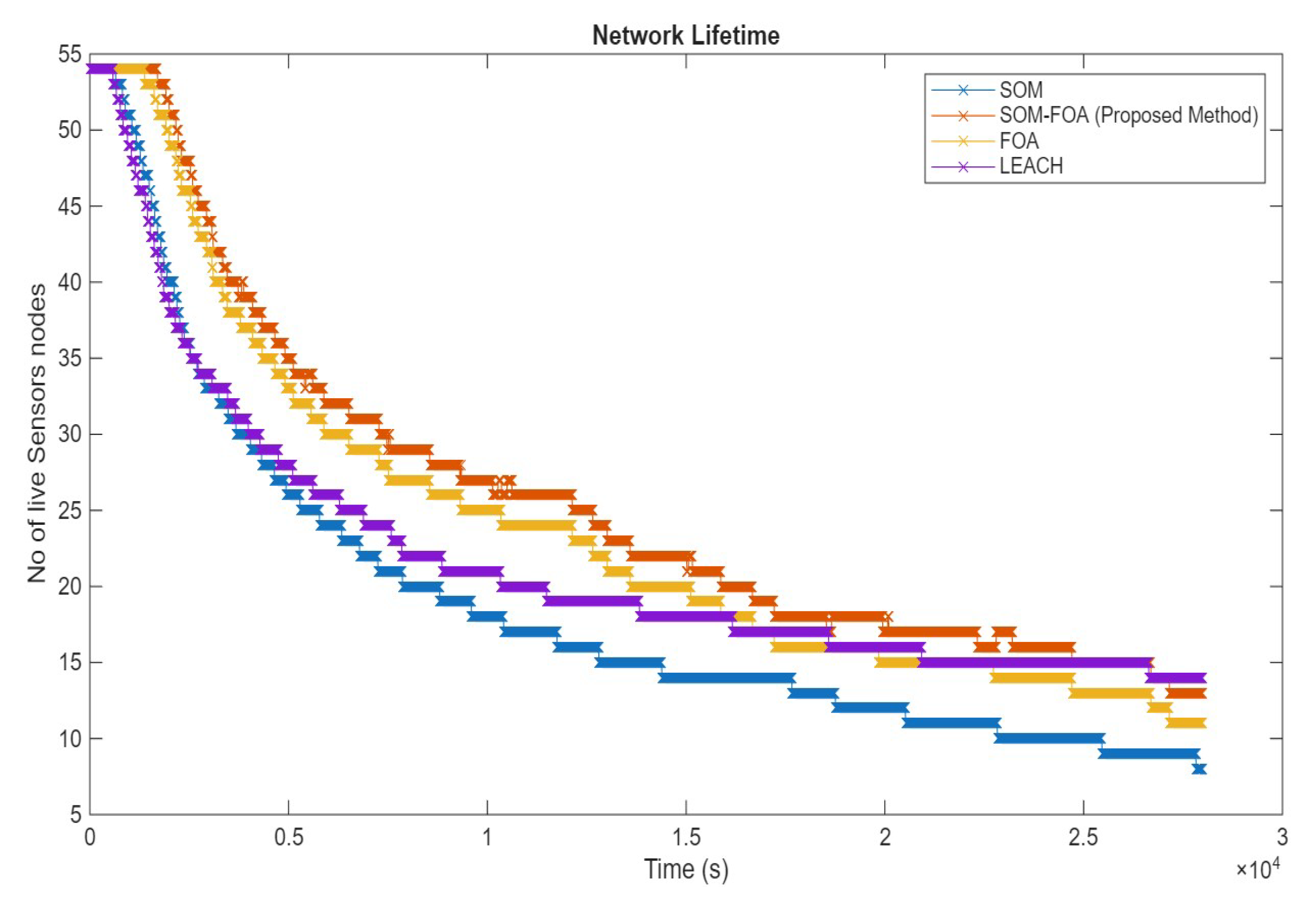 SOMThe SOM algorithm significantly reduces the number of transmitted packets in WSNs, effectively lowering traffic load and conserving sensor energy. This data aggregation approach improves overall network performance by enhancing energy efficiency and increasing the accuracy of the collected data.