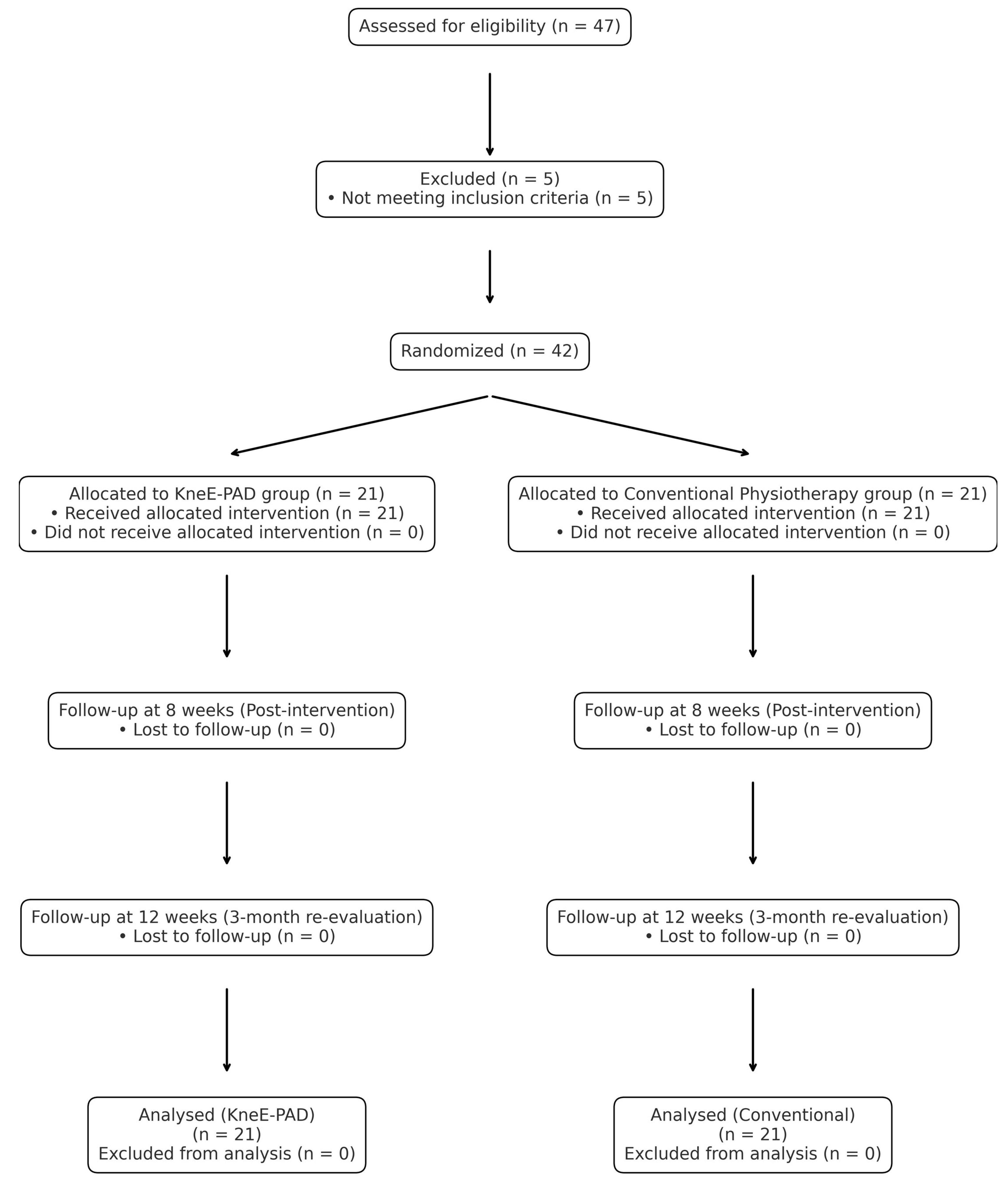Adherence was monitored using both self-reported logs and automated KneE-PAD platform records capturing session frequency, duration, and movement accuracy. Where digital logs were incomplete, adherence was supplemented by self-reports. Compliance rates were expressed as the percentage of prescribed sessions completed.