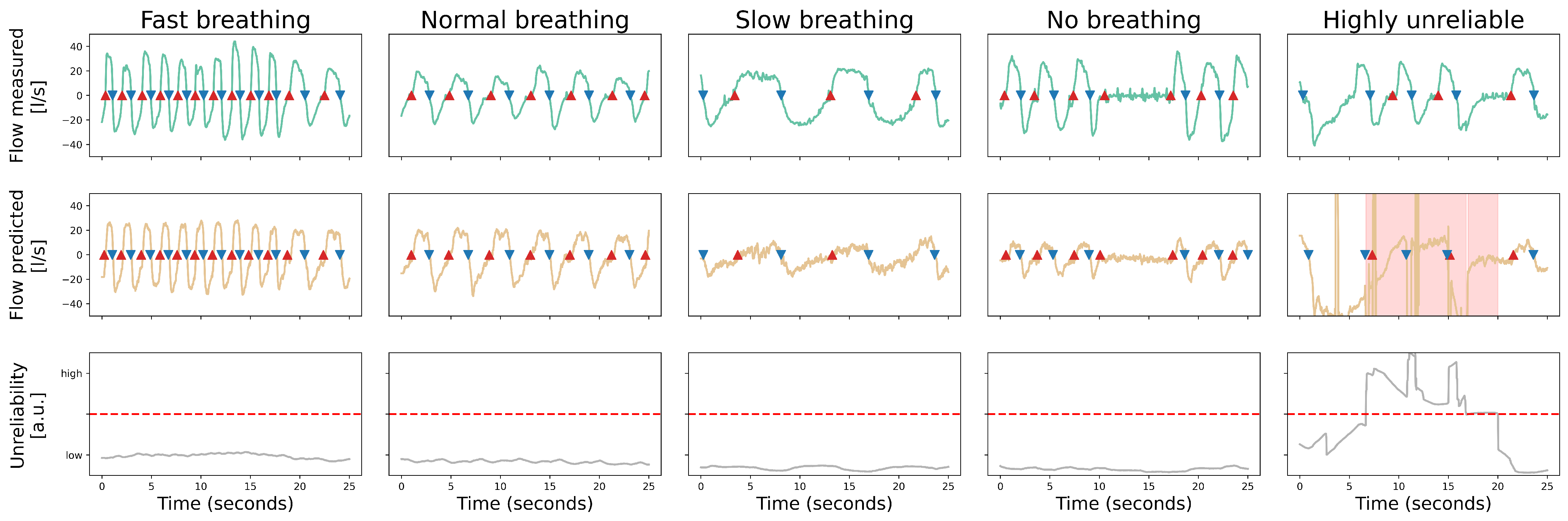 - The upper diagram shows a quantification of the observed respiratory signal (in ) via the reference flow meter.