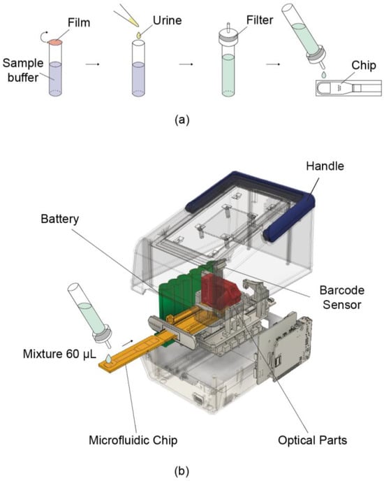 PMMA (polymethyl methacrylate) was used as cartridge material. Before assembly, injection molded parts were treated with plasma (500 SCCM of O2 flow for 320 s at 0.7 kW RF and 0.14 Torr). To stabilize fluid flow, a nano-interstice structure was introduced [17,18]. Prior to loading, the sample was mixed with a sample buffer at a 1:10 ratio and then applied to the inlet of the cartridge (Figure 1a). After loading, the cartridge was allowed to operate in the reader (Figure 1b).
