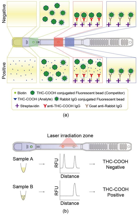 Principle of the competitive microfluidic immunoassay. (a) Schematic illustration of competitive binding reaction occurring inside the chip, depicting the mechanism for both THC-COOH-negative and -positive urine samples. (b) Representative fluorescence intensity graphs obtained after the fluorescent beads have reacted on the chip, showing differences in signal depending on the presence or absence of THC-COOH.