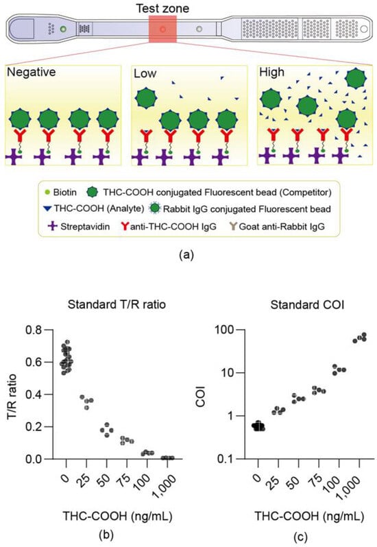 This device estimates concentration based on a competitive reaction mechanism (Figure 3a). Reliability was first checked at Expertox Lab (TX 77536, USA), which holds a laboratory-developed test (LDT) license. We measured samples prepared by spiking the THC-COOH standard into negative urine, and the T/R ratio, which is proportional to the number of fluorescent beads bound to the test dot, was found to be inversely proportional to the concentration (Figure 3b). This inverse relationship (Figure 3b) is characteristic of competitive immunoassays, which typically follow an inverse sigmoidal dose–response curve [23]. By optimizing the assay parameters for the operational range of interest, we minimize saturation effects, enabling the use of a simple reciprocal plot (COI) for effective linearization. When the sample concentration measured exceeded the cutoff level of 20 ng/mL, the COI value was above 1. The measured COI values made a good correlation with the concentration across a range of values.