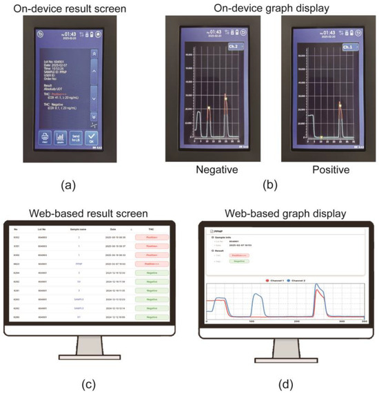 Upon completion of the concentration measurement, the reader display indicated the THC-COOH concentration levels as Negative or Positive {(+)[20 ng/mL], (++)[50 ng/mL], (+++)[100 ng/mL]}, along with a fluorescence graph corresponding to the position (Figure 6a,b). The reader was designed to connect to Wi-Fi to upload the fluorescence measurement graph and THC-COOH concentration levels (Negative, Positive {(+), (++), (+++)}), enabling consolidated result management (Figure 6c,d). This integrated readout and connectivity enhance the practicality and reliability of the device for on-site applications, where objective interpretation and robust data handling are crucial.