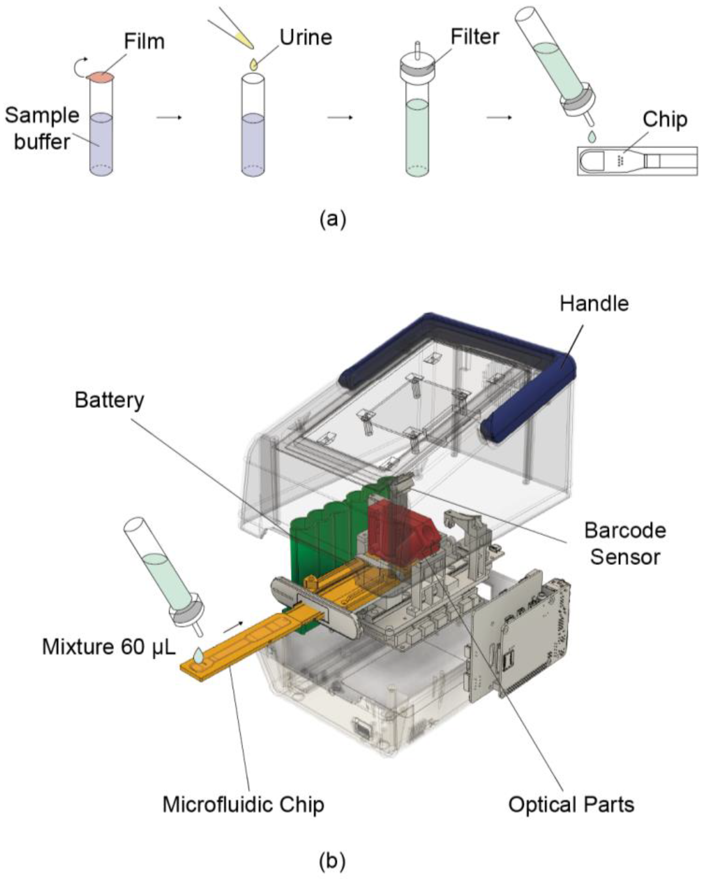 A urine sample was mixed with sample buffer at a 1:10 ratio, and 60 µL of the diluted solution was loaded onto the prepared cartridge. The cartridge was inserted into a reader (dimensions of 127 mm × 206 mm × 150 mm and a weight of 1.5 kg). The loaded urine sample flowed through the channel of the cartridge and reacted with the fluorescent beads at the test and reference dots for 4 min.