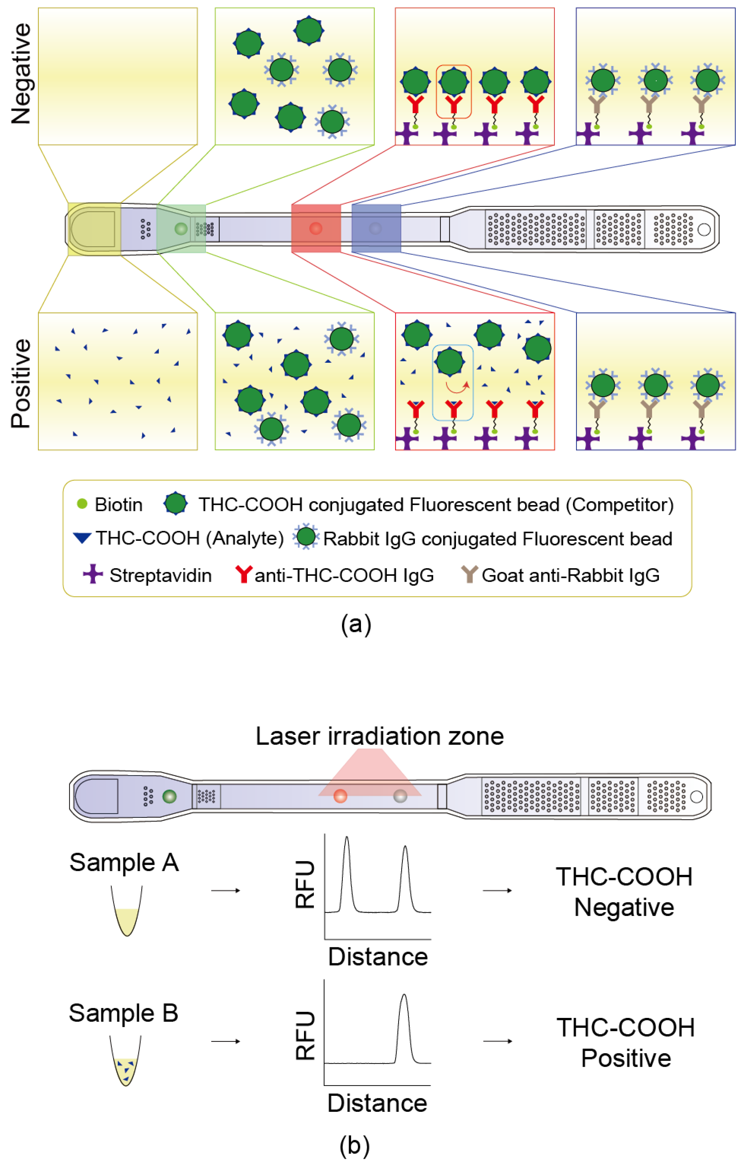 Two types of fluorescent beads were dotted onto the surface of the lower plate: a test bead conjugated with THC-COOH/Bovine Serum Albumin (BSA) and a reference bead conjugated with rabbit IgG. The test bead competed with THC-COOH present in the sample and bound to the anti-THC-COOH IgG located at the test dot. The reference bead was used to compensate for variations in fluorescence intensity that may arise from differences among human urine samples. It bound to goat anti-rabbit IgG immobilized on the reference dot (
