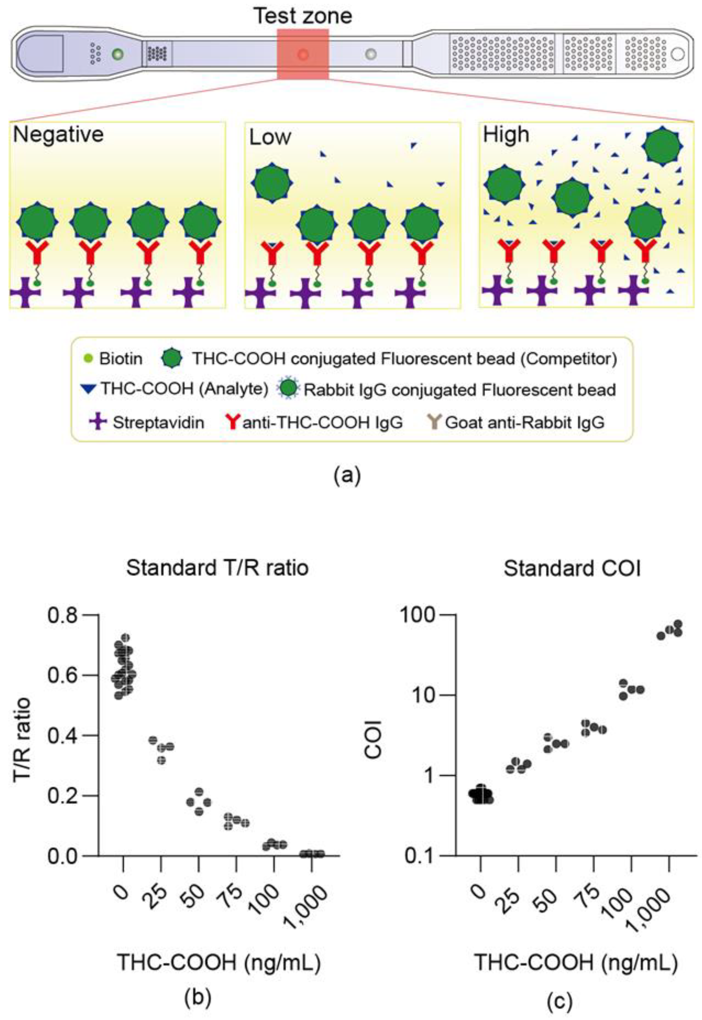 Streptavidin was used as a linker to immobilize anti-THC-COOH IgG (test line,