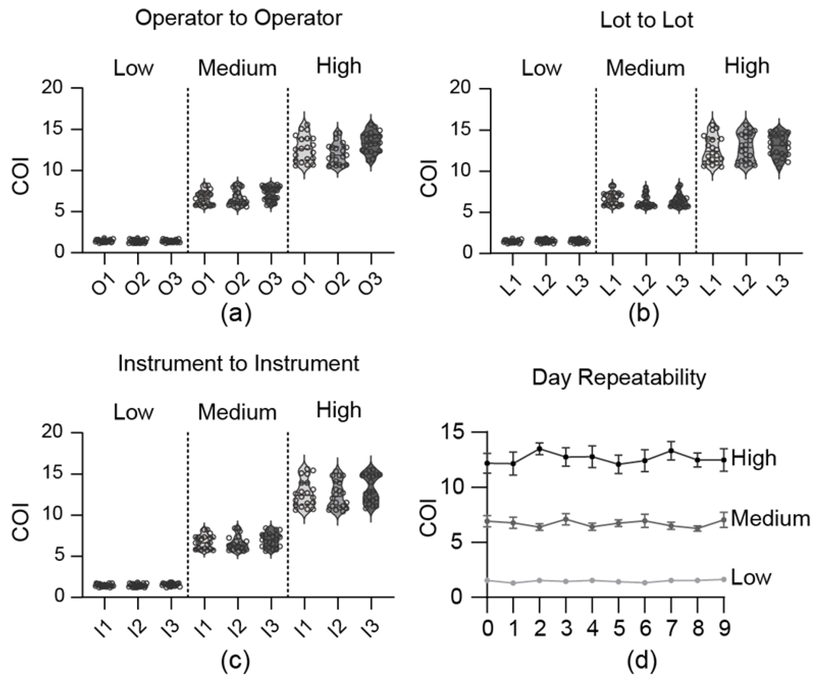 Performance evaluation was conducted under laboratory-developed test (LDT) protocol in a license holder, Expertox Lab (Deer Park, TX, USA), to assess standard testing, accuracy, operator-to-operator variability, lot-to-lot variability, instrument-to-instrument variability, repeatability, limit of detection (LOD), and limit of blank (LOB). For standard testing, samples were prepared by spiking blank urine with a THC-COOH reference standard (Cerilliant, T-101) at concentrations of 25, 50, 75, 100, and 1000 ng/mL. The cutoff ratio used in the COI (cutoff index) was at a concentration of 20 ng/mL. The reproducibility (operator-to-operator, lot-to-lot, instrument-to-instrument) and repeatability of the device were assessed; low-, medium-, and high-concentration samples were prepared by dissolving the THC-COOH standard (Cat. # T-019, Cerilliant, Round Rock, TX, USA) in negative buffer composed of 1X PBS (pH 7.4) and 0.05% sodium azide. The concentrations of the prepared samples were 50 ng/mL (low), 100 ng/mL (medium), and 1000 ng/mL (low, medium, and high, respectively), and their cutoff value was 20 ng/mL. Three lots (584902, 584903, and 584904) were tested, with ten replicates for each lot at each of the three concentrations (low, medium, and high), for a total of 30 tests per lot. An operator-to-operator test was performed using lot 584902 by three operators, conducting four tests each per concentration (low, medium, and high) per day for five consecutive days: 60 tests per operator in total. Three lots (584902, 584903, and 584904) were used for the lot-to-lot tests. For each lot, four tests per concentration were conducted per day for five days, resulting in 60 tests per lot. The instrument-to-instrument test was conducted using lot 584902 across three different instruments. Each instrument was used to perform four tests per concentration per day over five days, for a total of 60 tests per instrument. The LOB samples consisted of a negative buffer [1X (10 mM) PBS (pH 7.4), 0.05% sodium azide], whereas the LOD samples were prepared by spiking the same negative buffer with 50 ng/mL of the THC-COOH reference standard (Cat# T-109, Cerilliant).