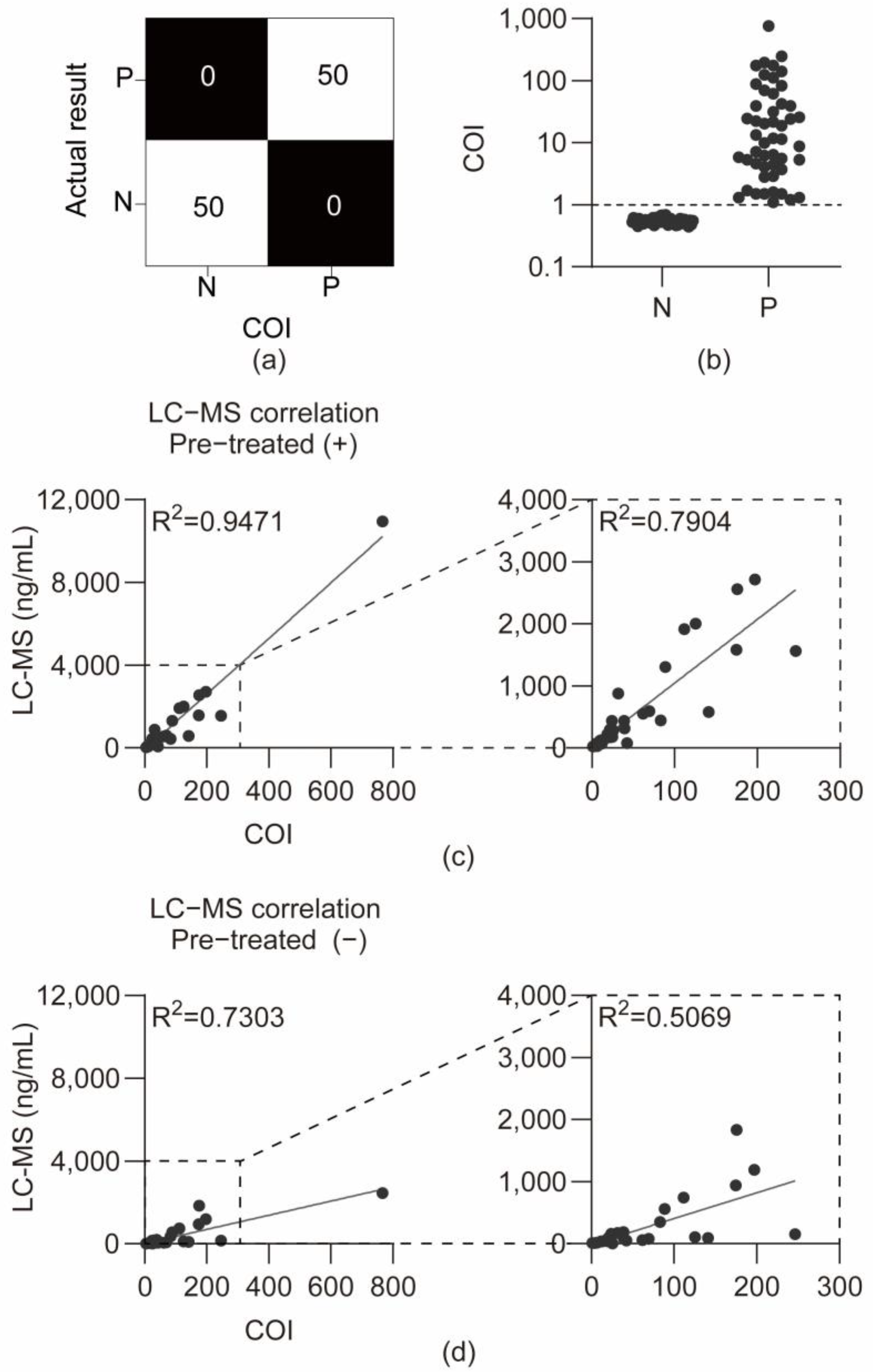 24]. To evaluate whether immunoassays can be performed without hydrolysis, authentic cannabis-positive urine samples were analyzed using validated LC-MS/MS methods, both with and without β-glucuronidase treatment. The measured THC-COOH concentrations were compared with the COI values obtained from the developed device. When glucuronide-bound THC-COOH was hydrolyzed to its free form, the correlation between LC-MS/MS concentrations and COI values was high (R
