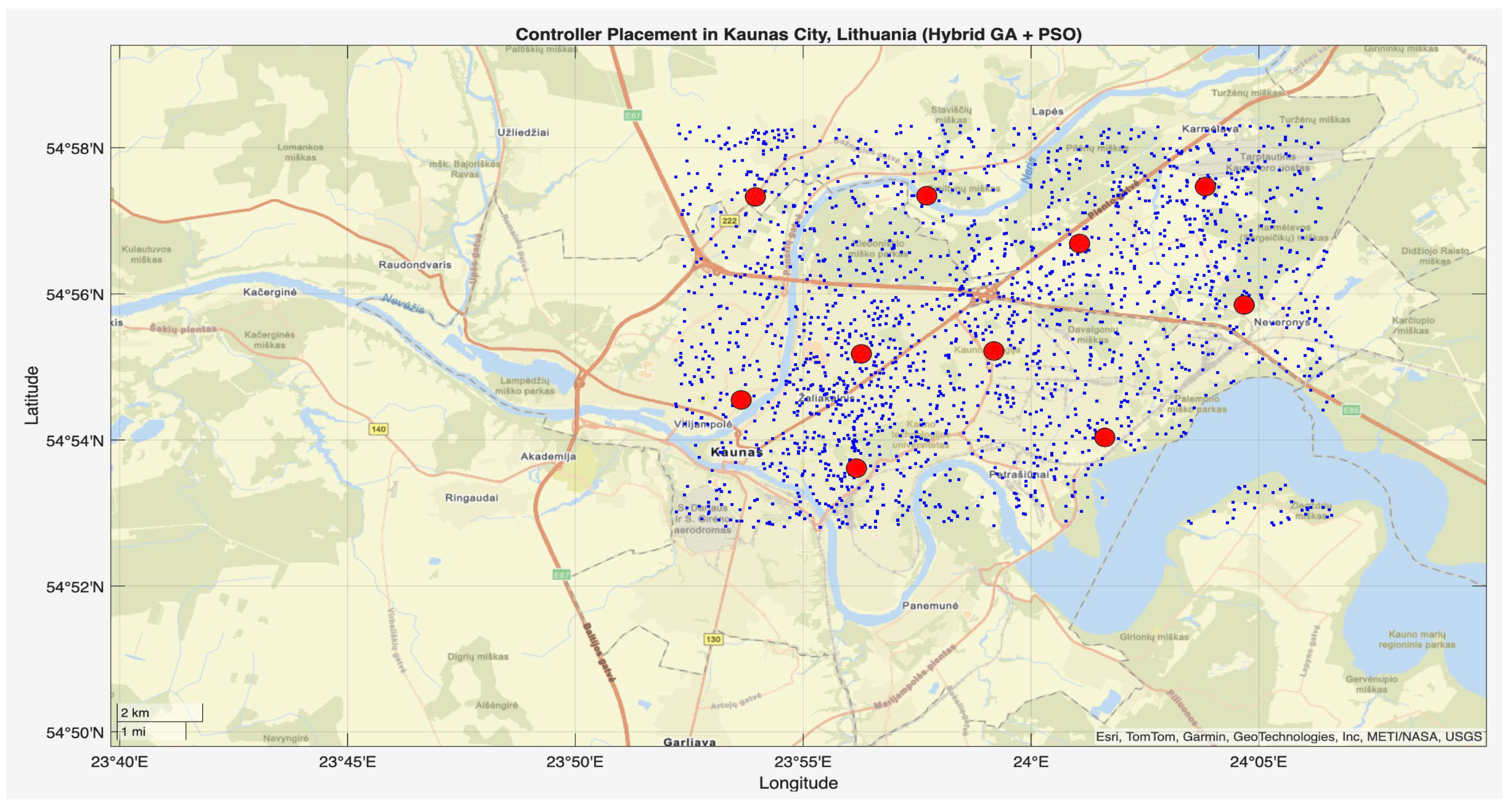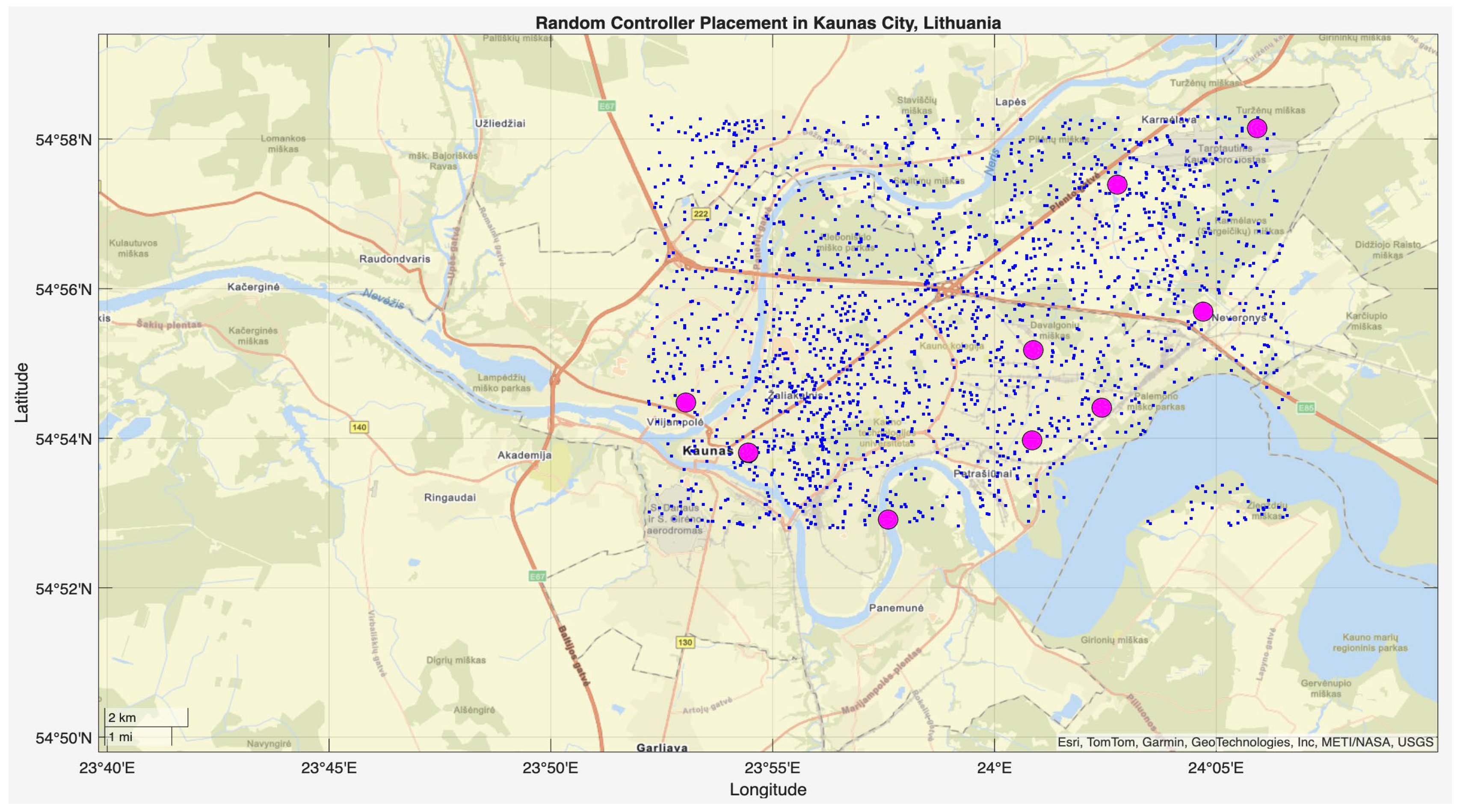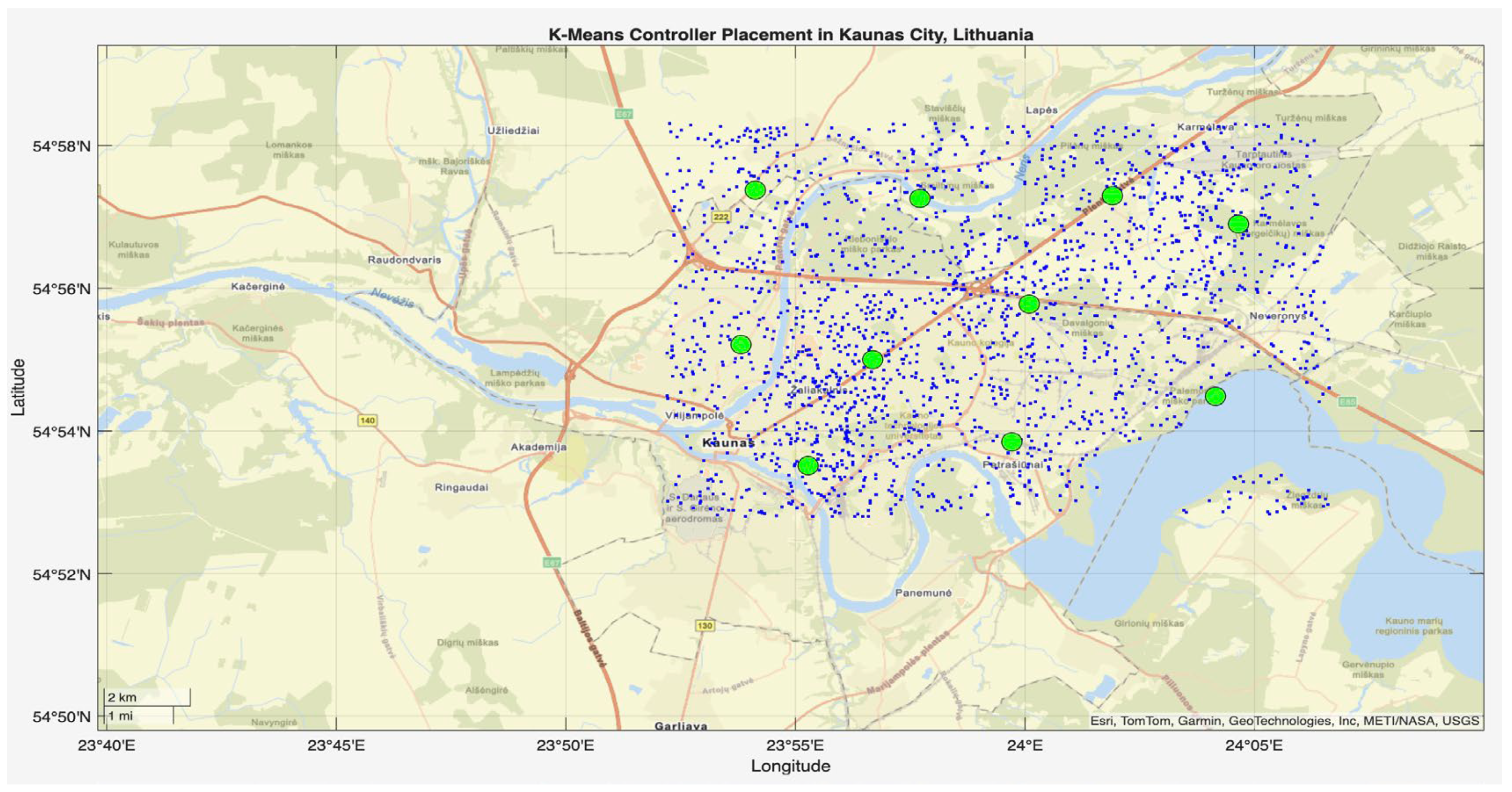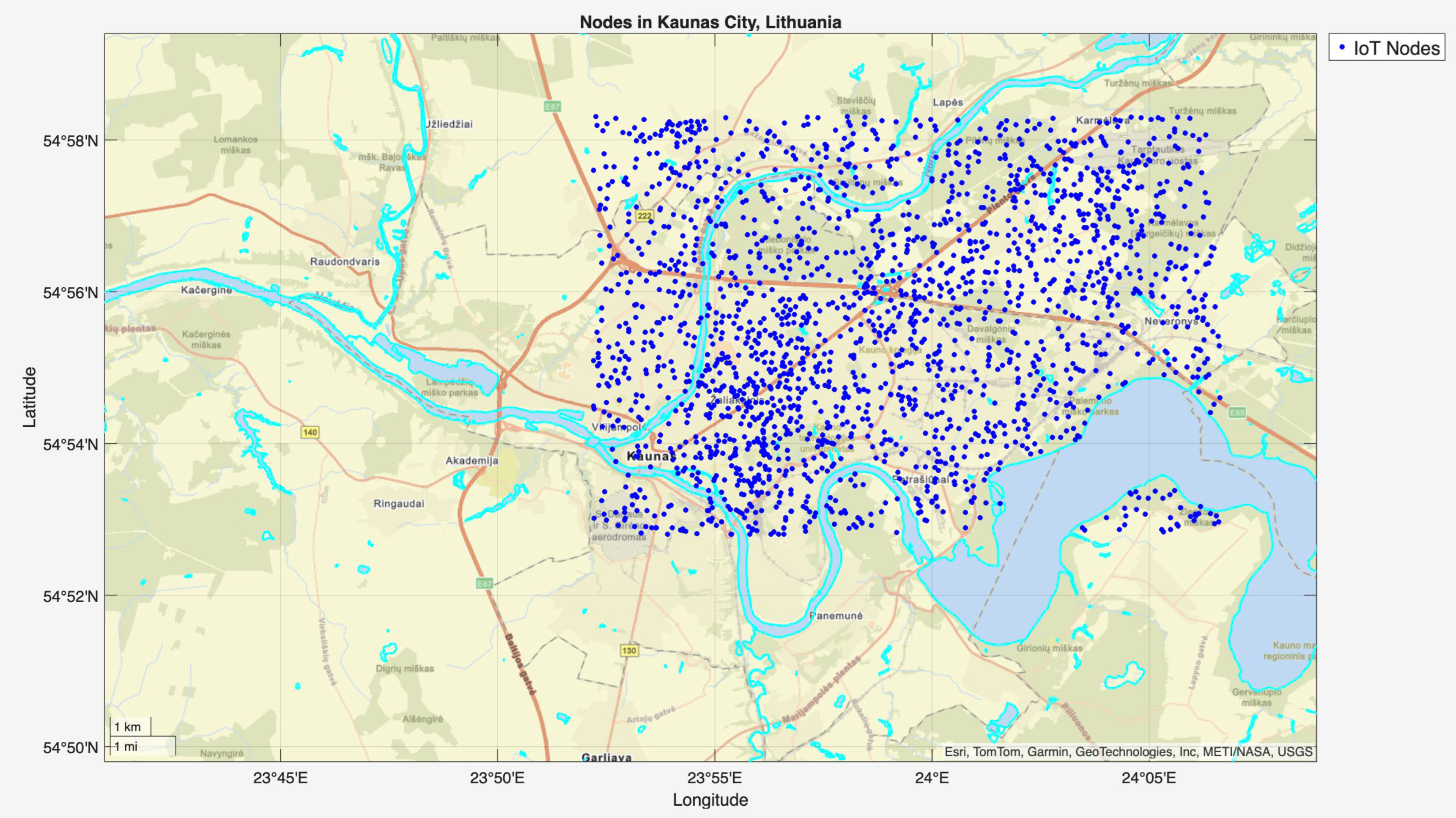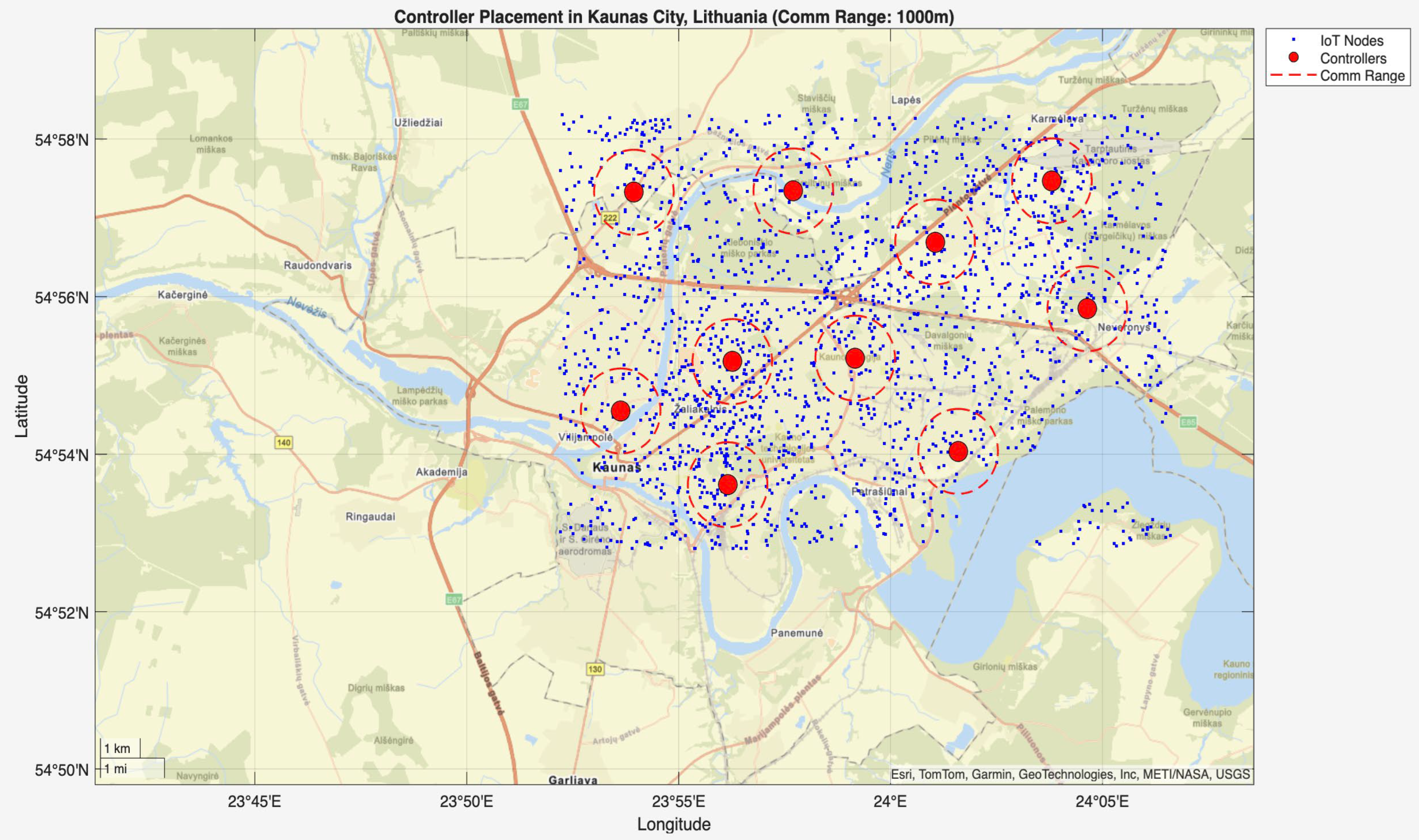 - A real city-based IoT network model of Kaunas (Lithuania) has been setup, comprising 2000 nodes, 10 controllers, and 2 communication ranges of 1000 m and 3000 m, to evaluate performance under valid geographic and density conditions.