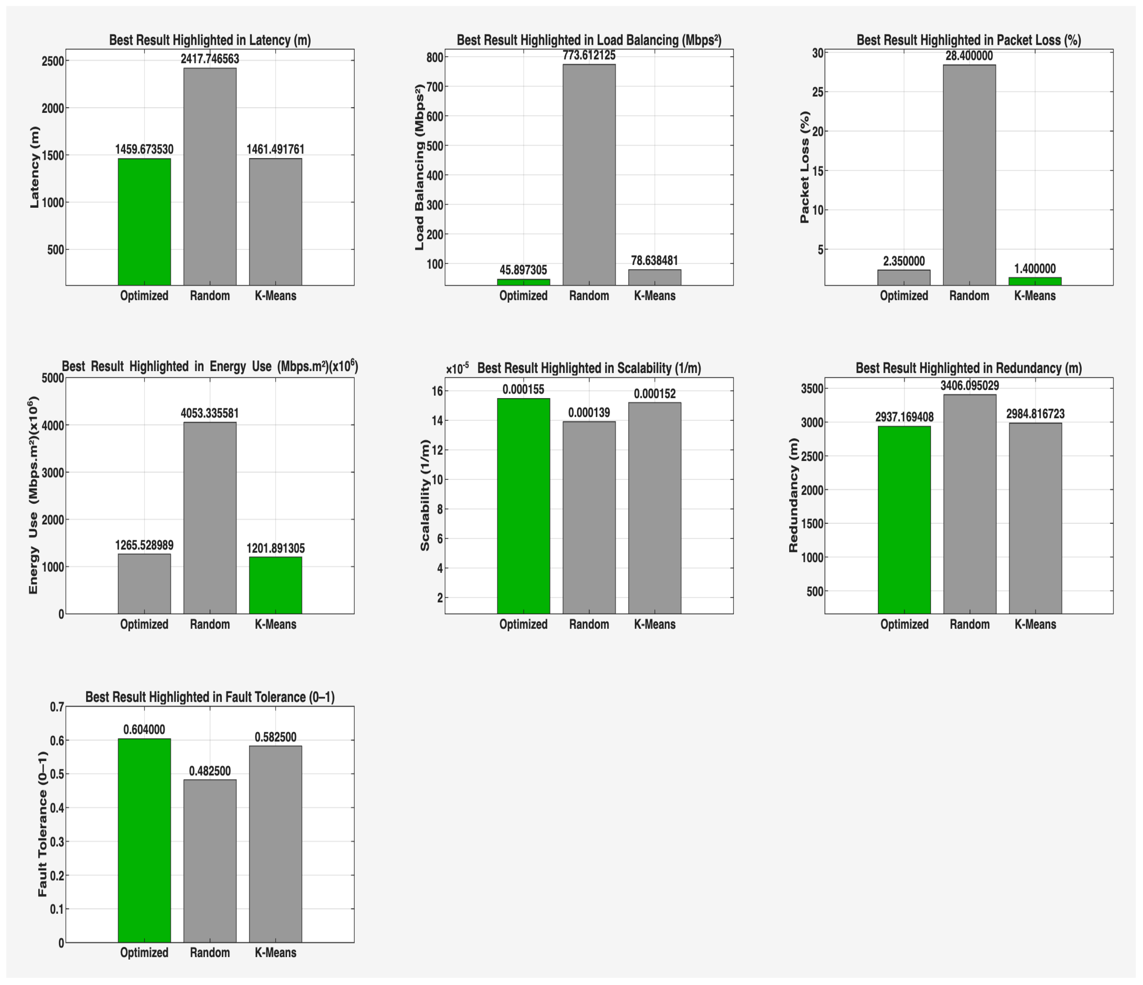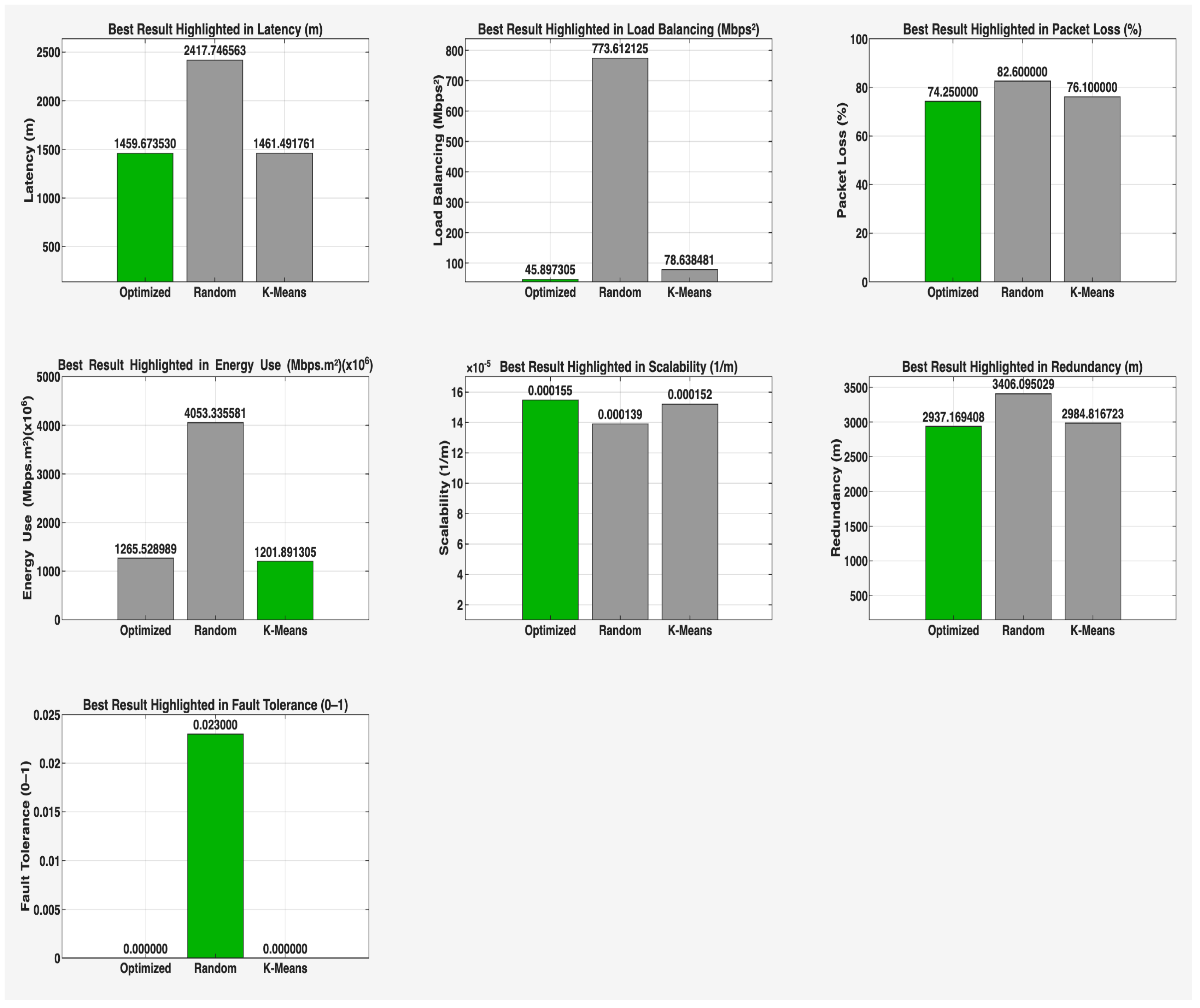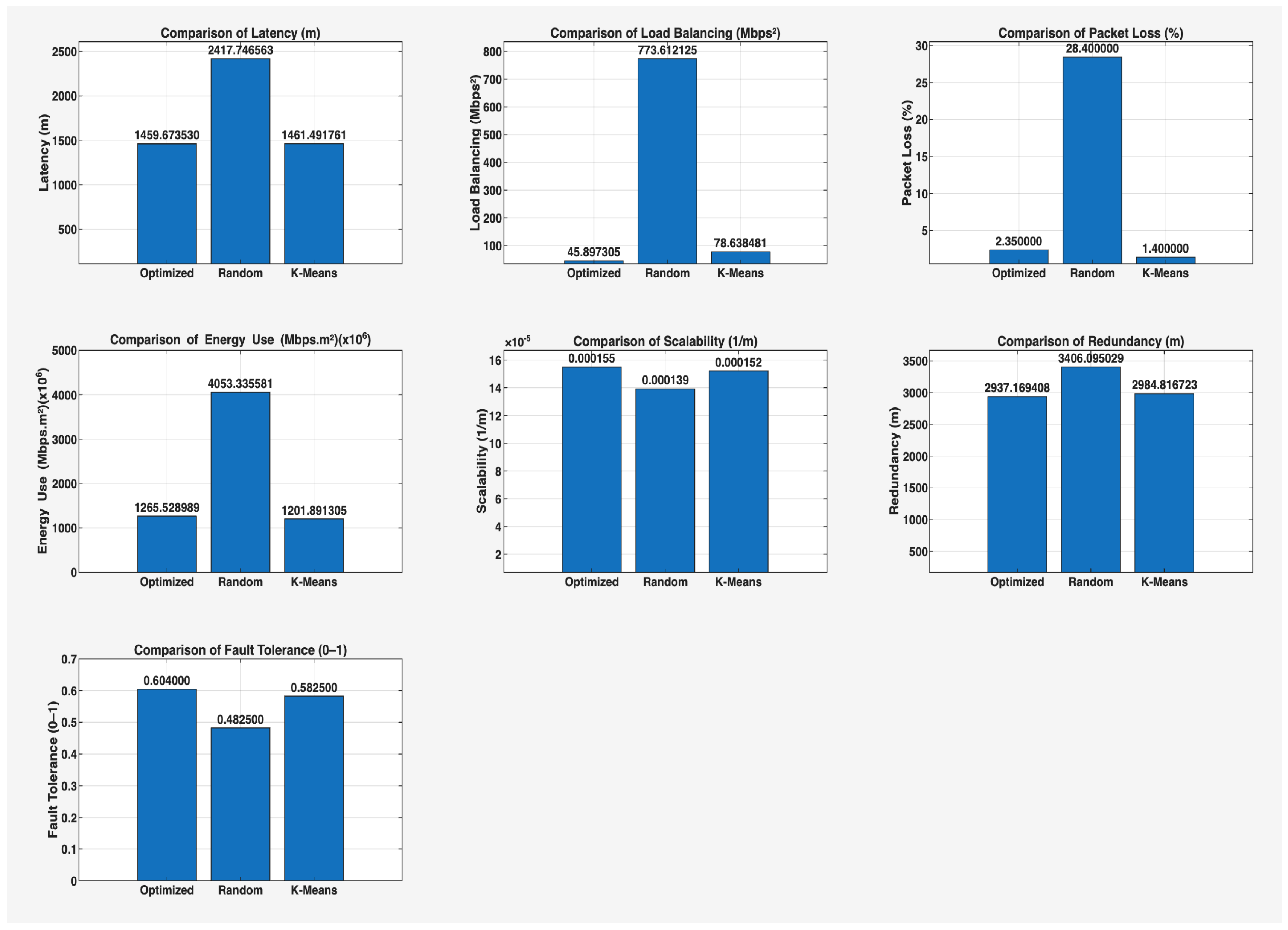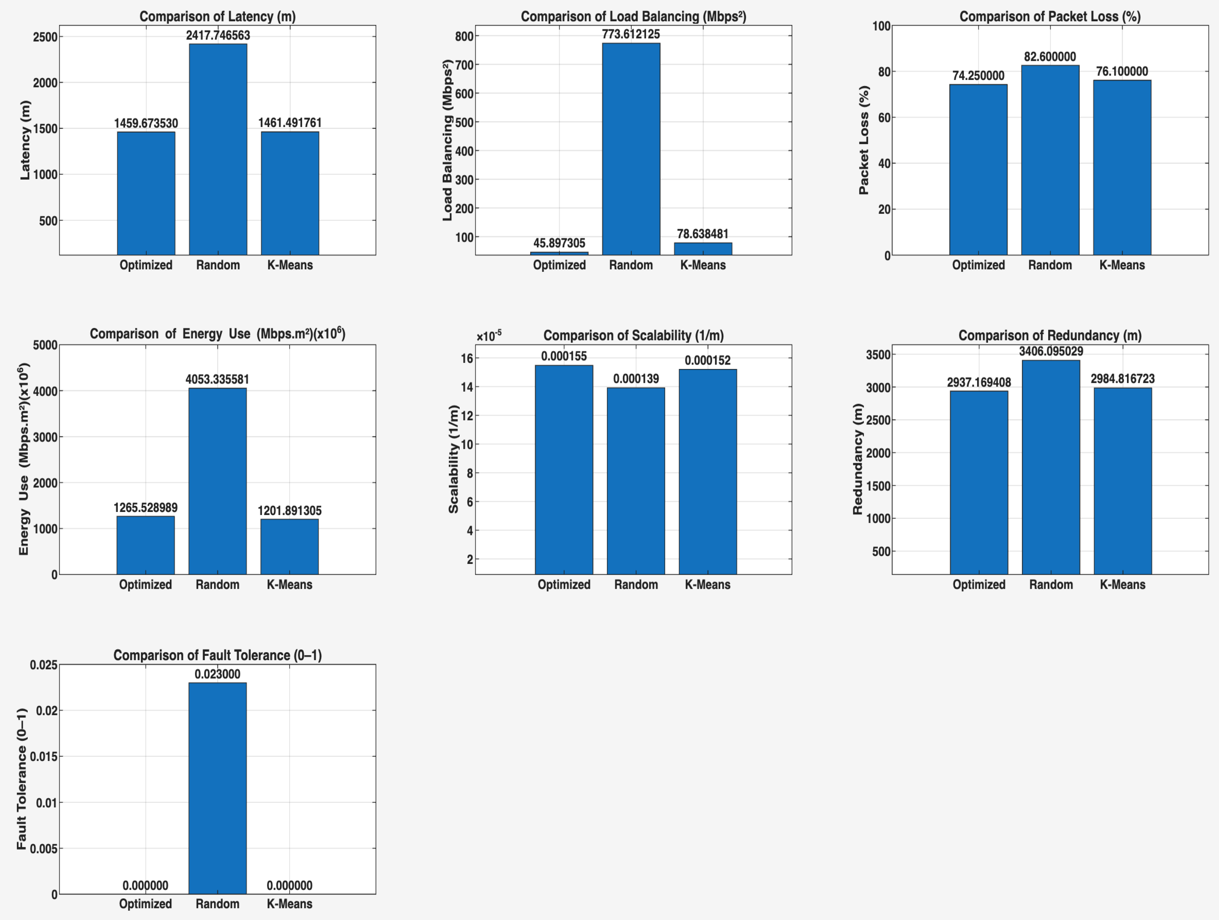 | Metric | Optimized | Random | K-Means | |||