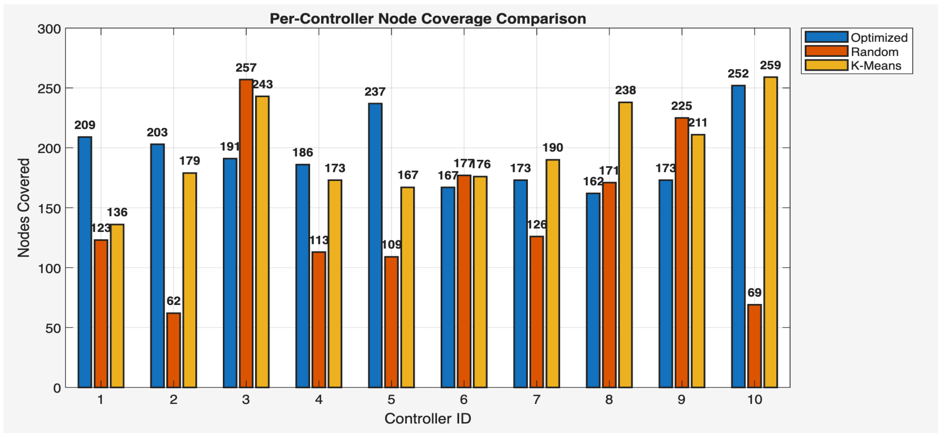 | Controller No: | Optimized (1000 m) | Random (1000 m) | K-Means (1000 m) | Optimized (3000 m) | Random (3000 m) | K-Means (3000 m) |