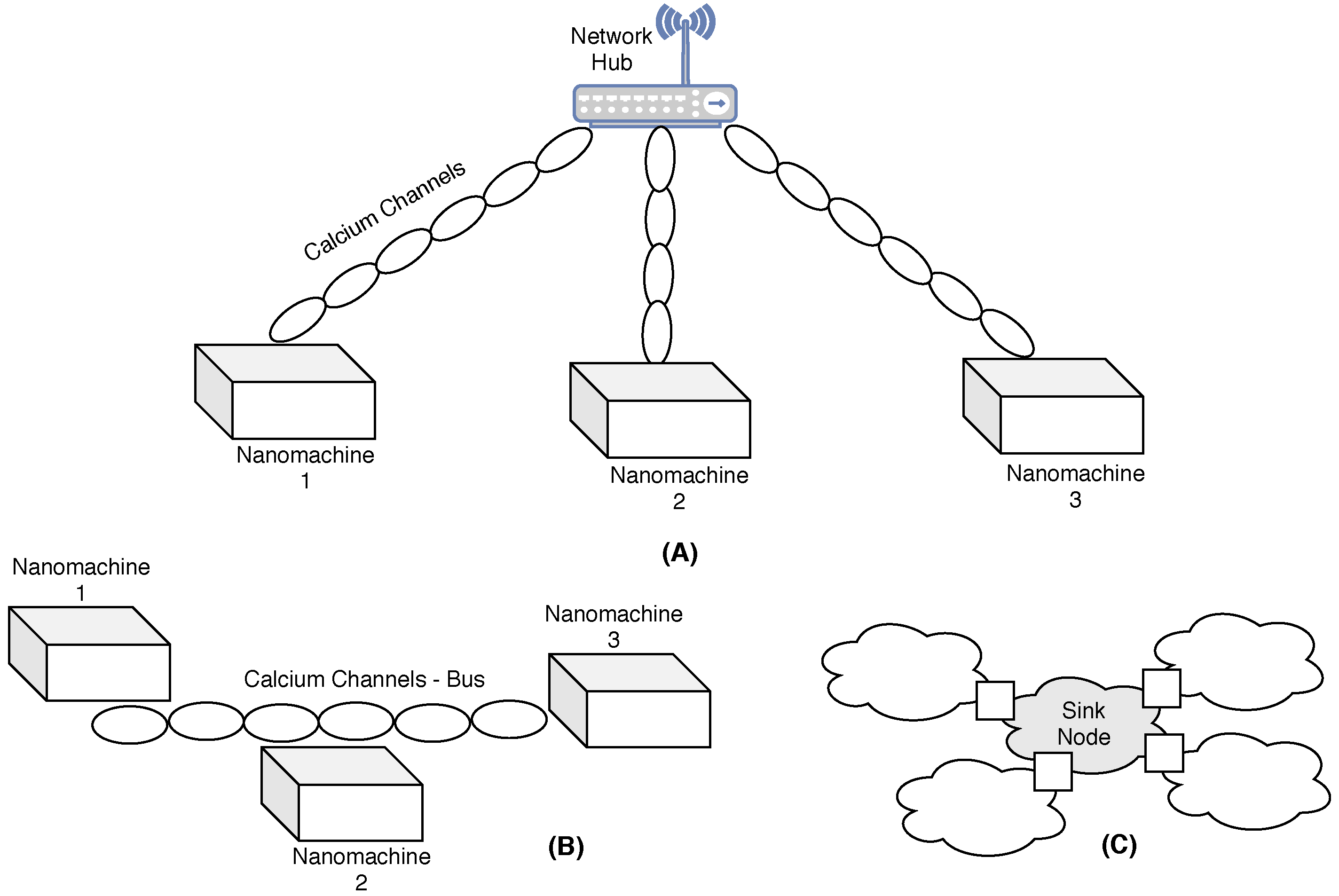 - Bus topology: All NSs are connected via a bus of calcium cells. Any NS can send data to another NS by triggering the calcium cell closest to it to send a signal representing the data. The signal keeps propagating through the bus of cells until it reaches the closest cell to the receiver. Then, the receiver cell will decode the information and send it to the receiving NS using another molecular communication scheme.