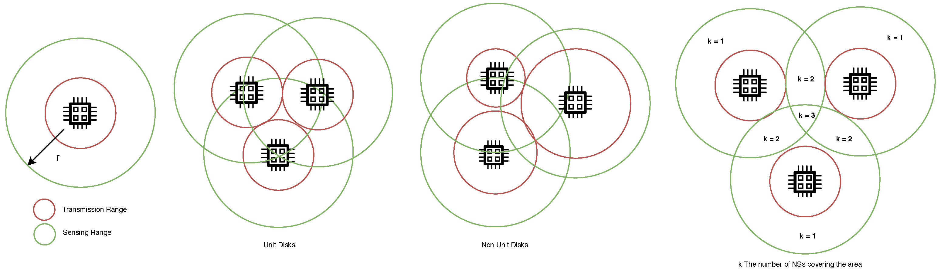 - Non-unit disk, when the sensing range of NSs differs [61].