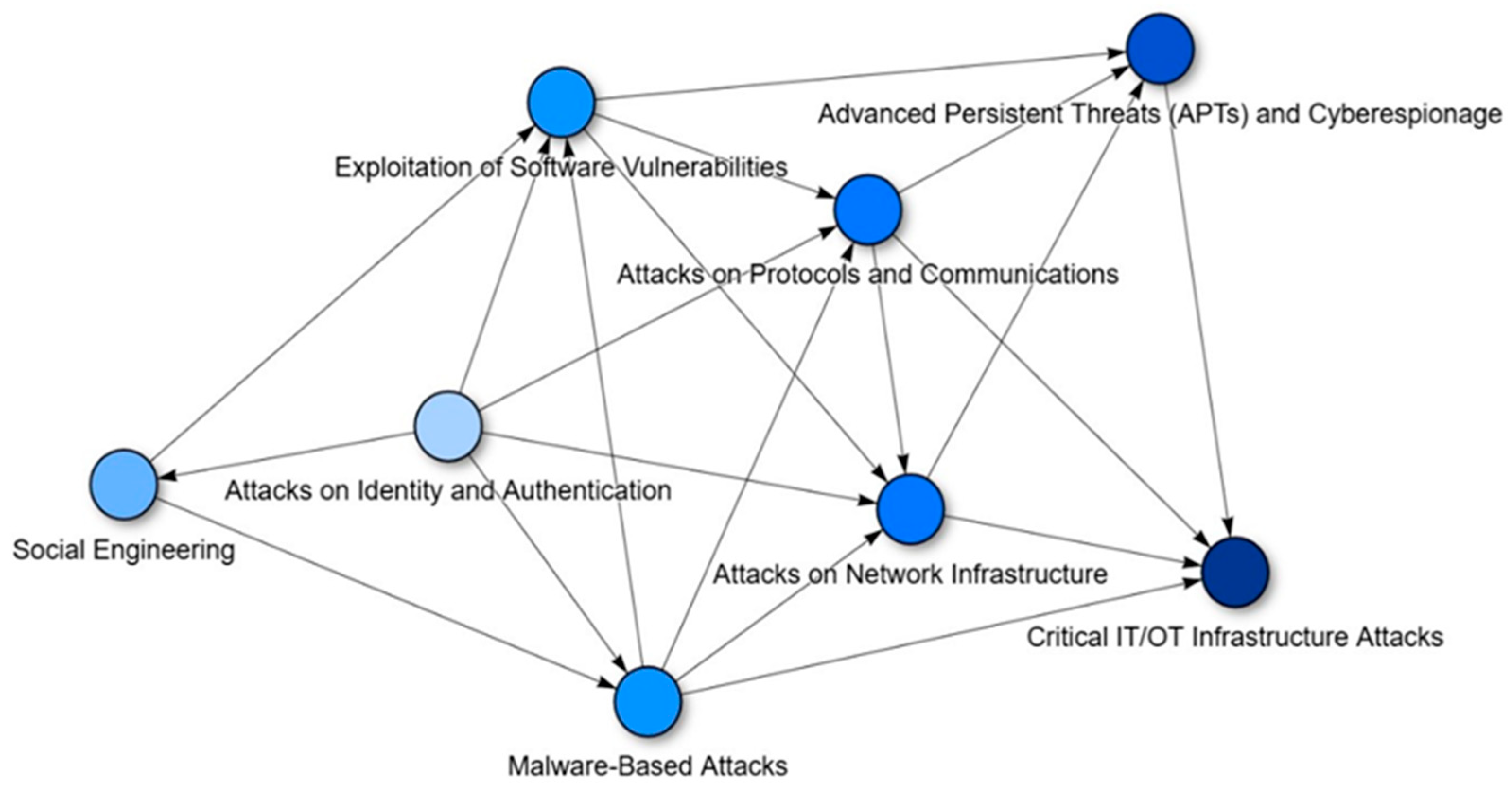 - Network Infrastructure Attacks (NIAs) → Attacks on Critical IT/OT Infrastructure (CIIA): Attacks on network infrastructure are often precursors to deeper compromises of critical infrastructures. A prominent example is the evolution of the BlackEnergy group into GreyEnergy, which (after compromising internet-exposed routers and servers) used this access to deploy backdoors and malware targeting industrial systems. This approach enabled lateral movement into OT networks, affecting strategic sectors such as the energy industry in Ukraine and Poland through tools designed to sabotage operations and conceal their presence [102].