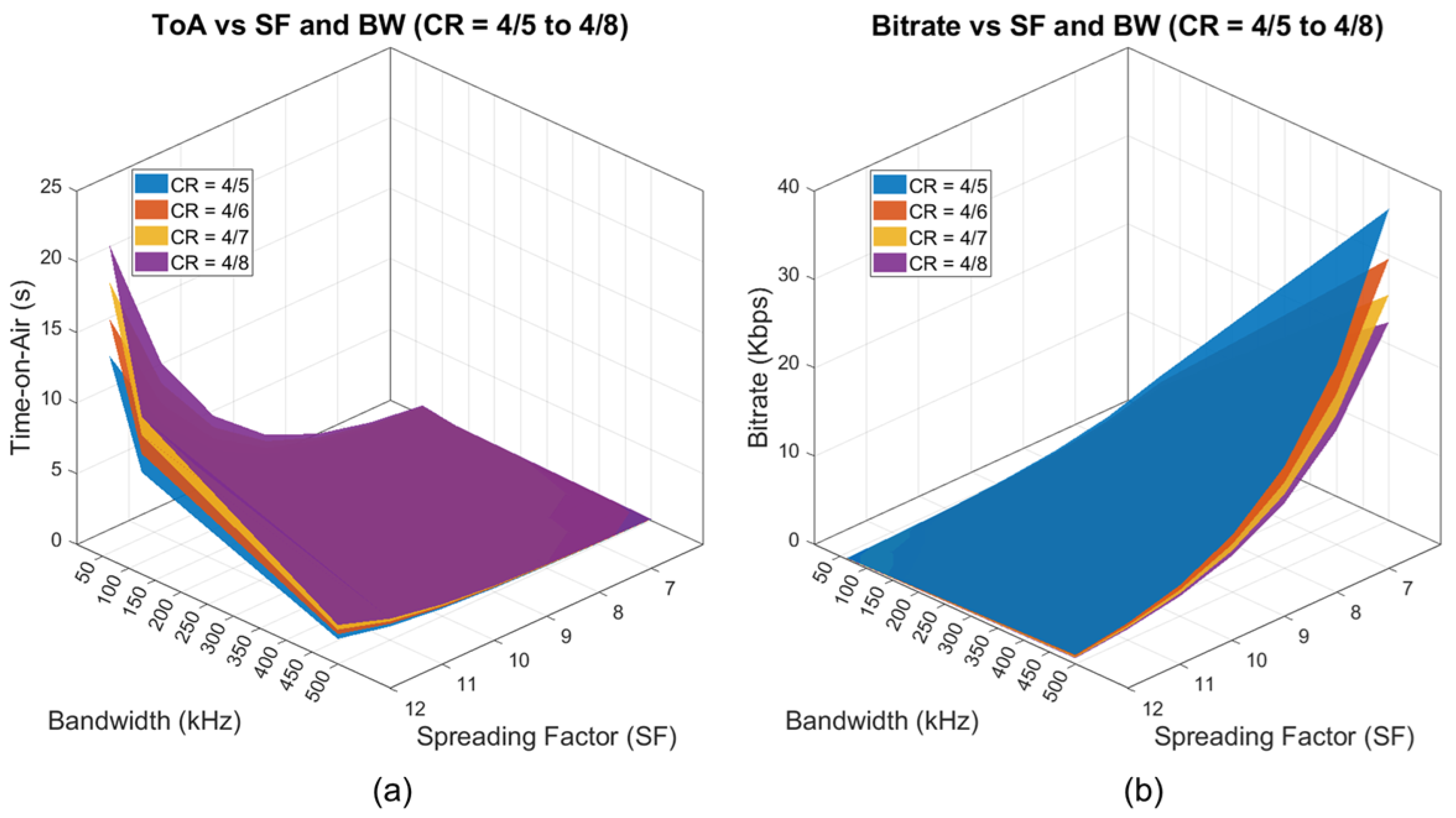 | ToA | LoRa PHY (SF, BW, CR) | Increases exponentially with SF; limits available airtime under regulatory rules |