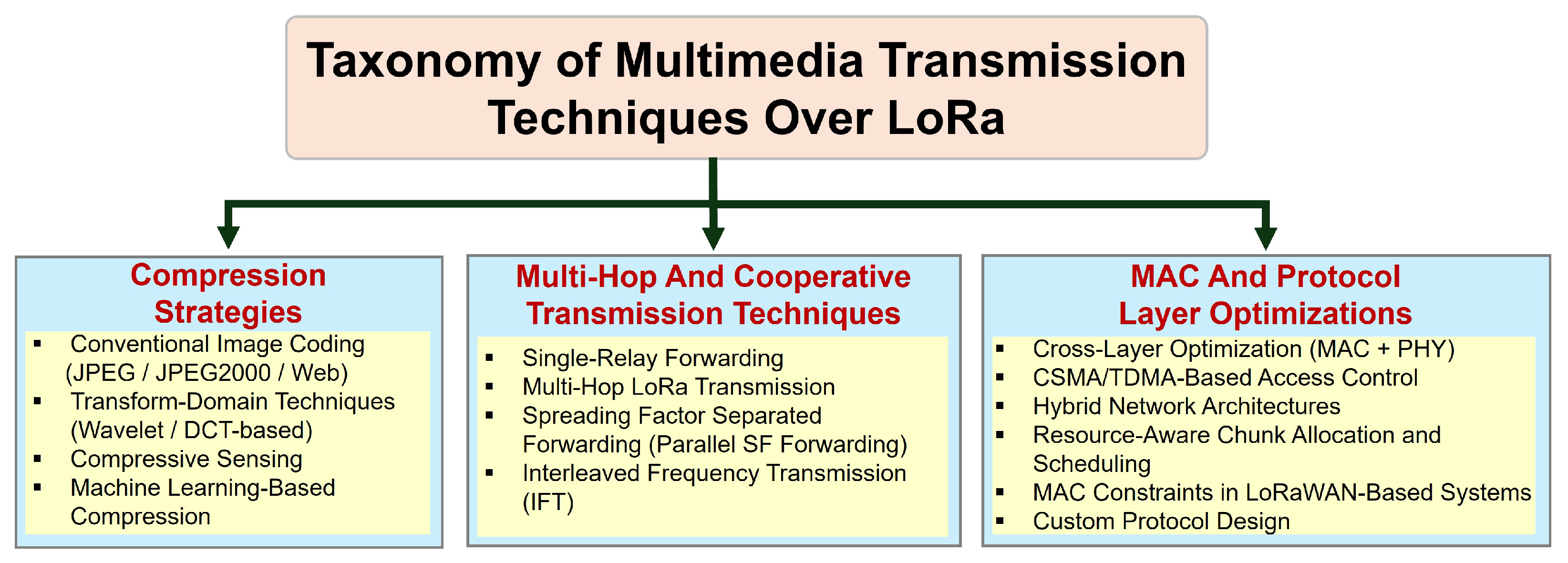 - We provide a structured taxonomy of LoRa-based multimedia transmission strategies, including compression, cooperative forwarding, and MAC-layer optimization.