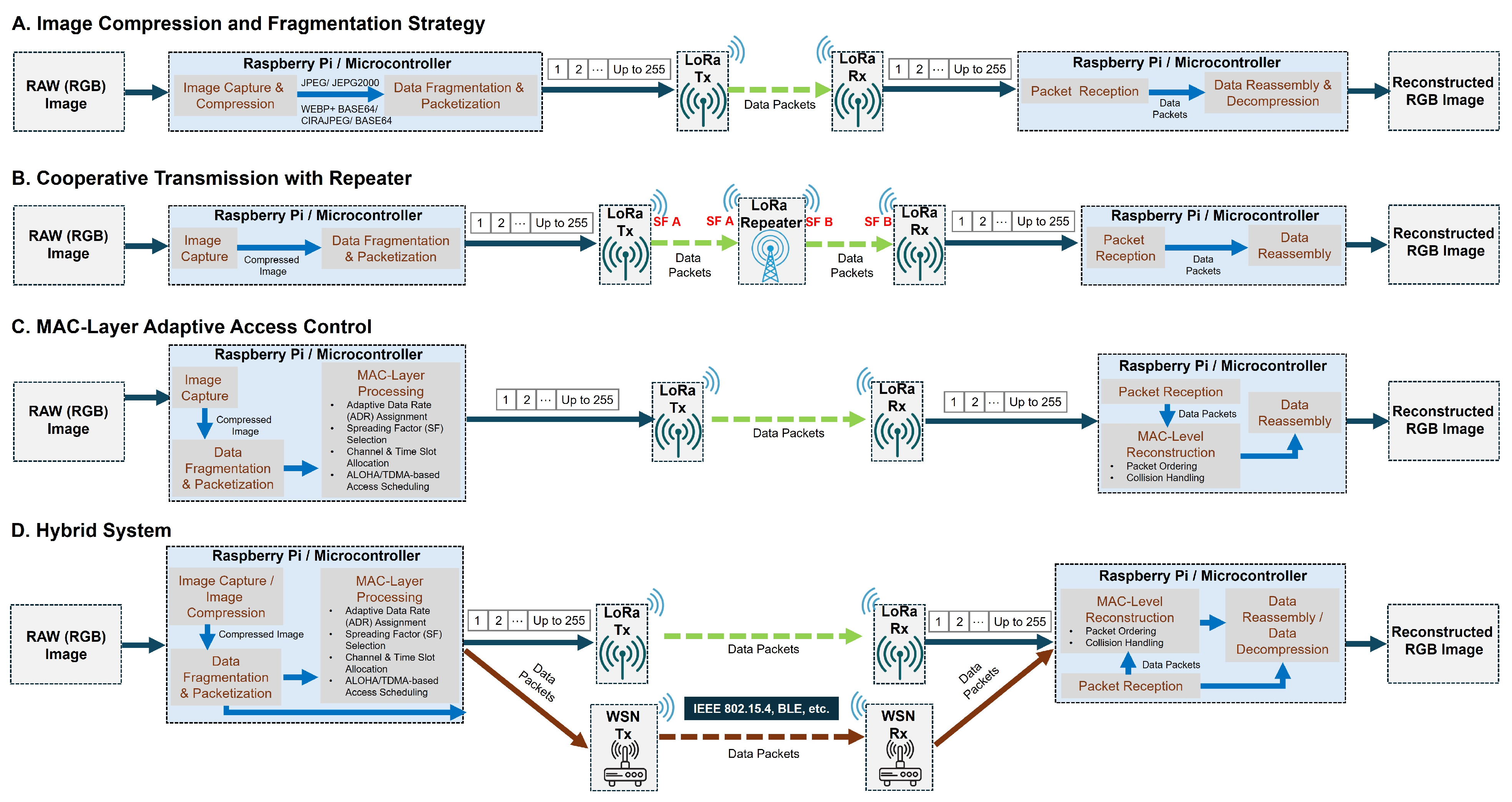 | Fragmentation Overhead | LoRa PHY | Requires division of images into 20–100 small packets due to LoRa’s 255-byte limit, increasing header overhead, energy usage, and risk of packet loss |