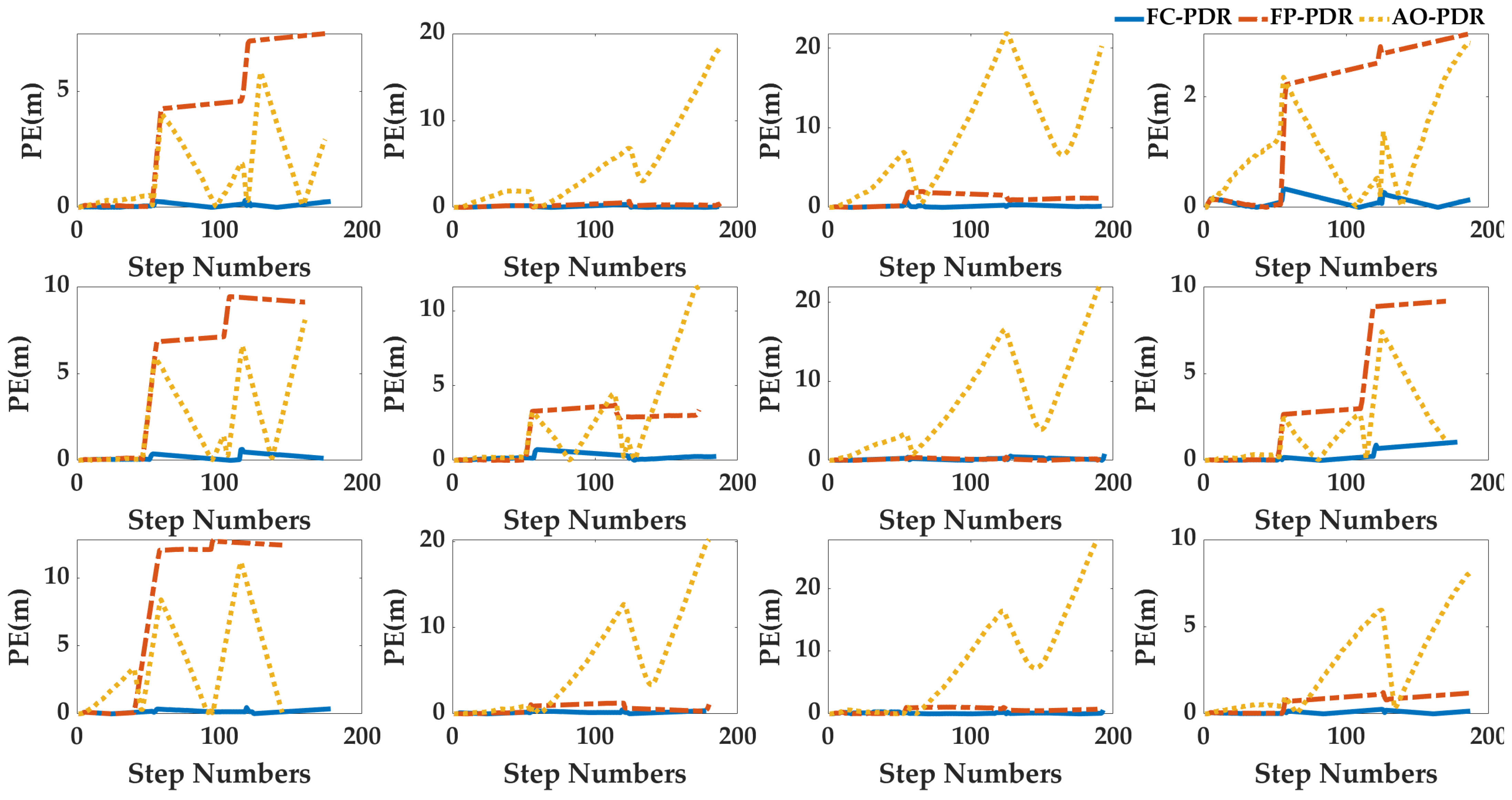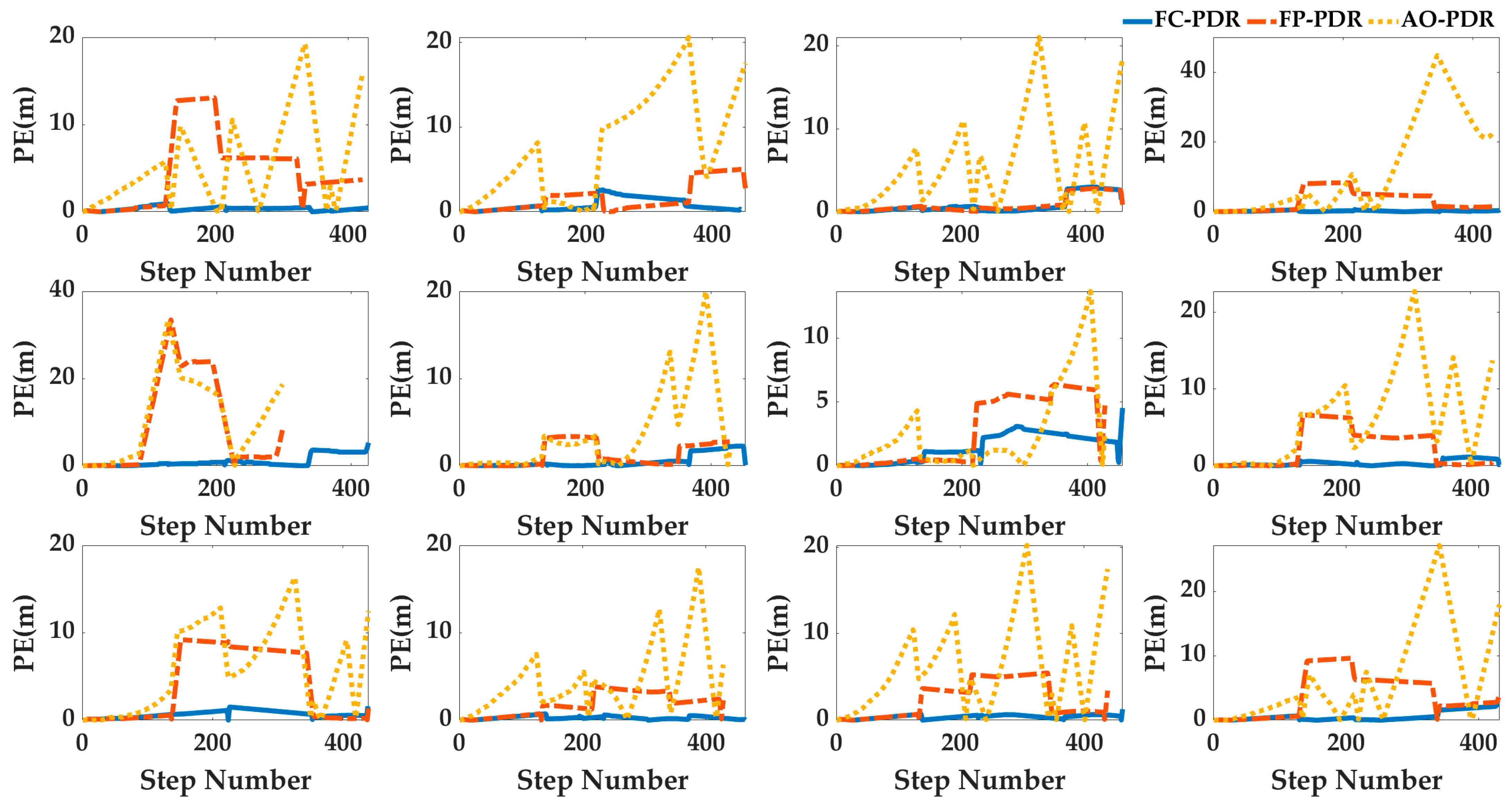 | FP-PDR | Binary detection with fixed parameters | Weinberg model with fixed parameter | Based on FC-PDR, the heading correction is adjusted according to the pedestrian motion state. | [9.88, 50, 0.55, 15, 10, 10] |