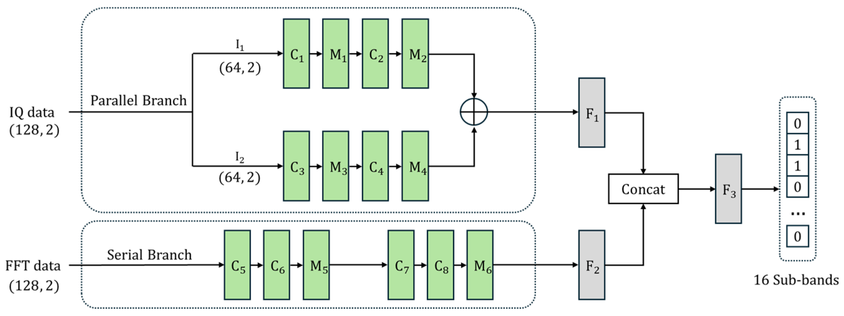 FFT-Serial Branch: This branch analyzes the FFT data using a single, deeper serial CNN. As the spectral shape, energy distribution, and band characteristics all differ depending on the occupancy state of each sub-band, the CNN is trained to learn this direct correspondence.
