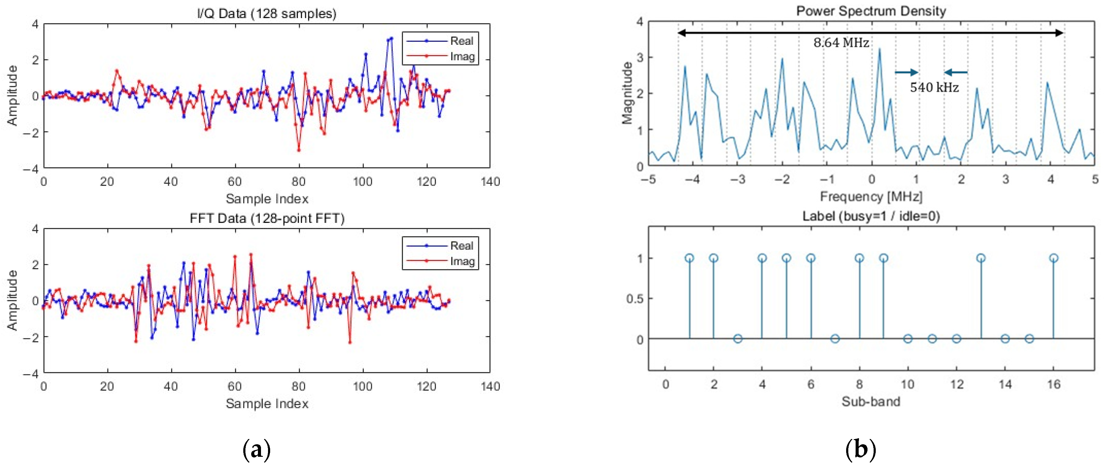 -th sub-band is unoccupied. To emulate non-line-of-sight (NLOS) channel conditions, all transmission signals were passed through a Rayleigh fading channel and subjected to additive white Gaussian noise (AWGN). A comprehensive collection of 65,536 transmission samples per SNR was generated across a wide range of SNR levels, from −20 dB to 10 dB, to thoroughly assess the models’ robustness against noise. To maintain consistency and stability during the training process, the average power of all input signals was normalized to 1.