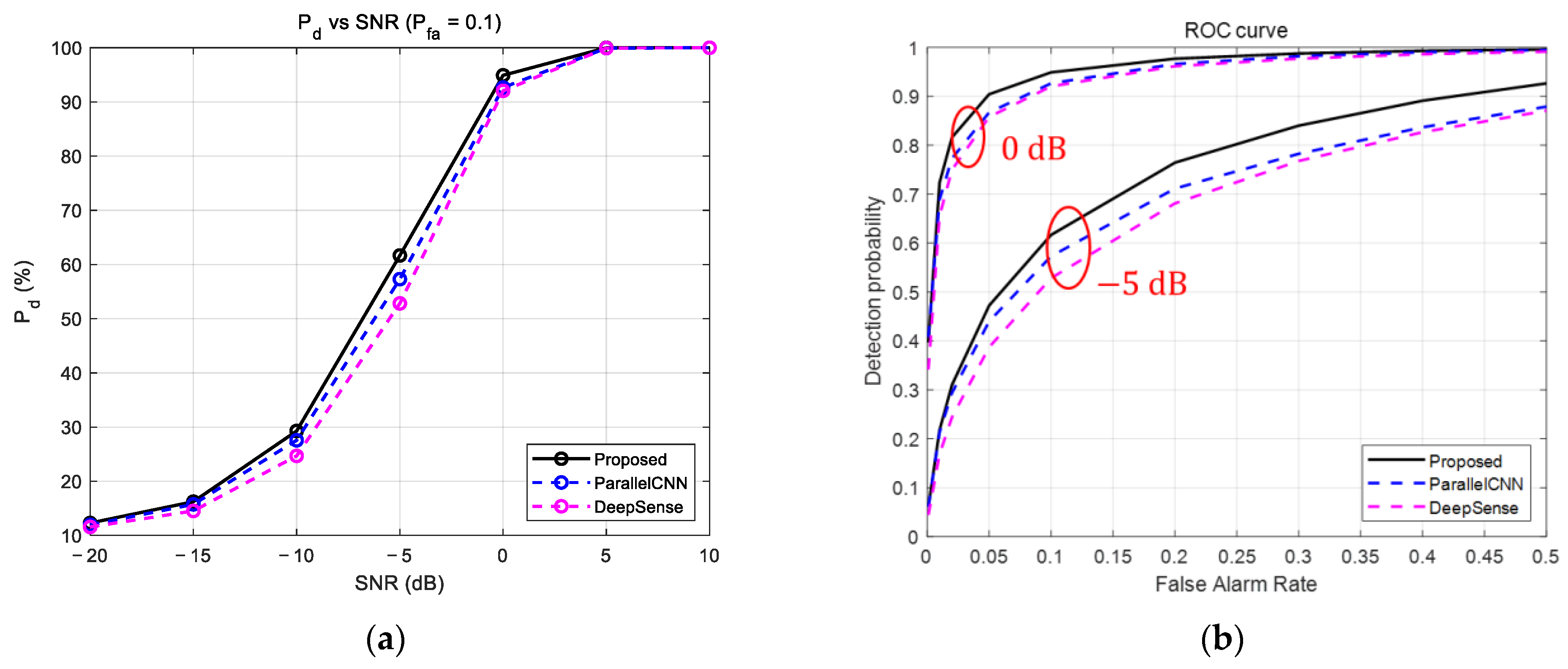 Figure 3b provides a more detailed view of the models’ detection performance through ROC curves at SNR conditions of 0 dB and −5 dB. It is evident that the proposed model’s curve is positioned closest to the top-left, indicating the best performance among the three. This means that for the same