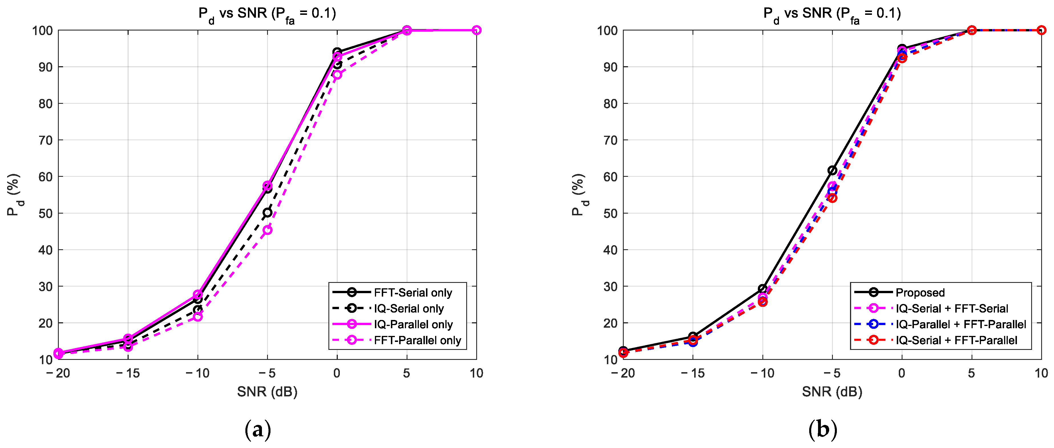 Figure 5b. Our proposed IPFSCNN, which uses the asymmetric design (IQ-Parallel + FFT-Serial), outperformed all other fusion combinations. For instance, at an SNR of −5 dB, its detection performance (black solid line) was approximately 3–5% higher than these other combinations. This comparison demonstrates that merely fusing two data streams is insufficient. The key factor is how the data is fused; the best performance is achieved by combining feature extractors that are each optimized for their specific data type. This result proves that the high performance of IPFSCNN is not simply an artifact of using two branches, but a direct result of its intentional, asymmetric architecture, which applies the optimal processing method to each data’s unique characteristics.