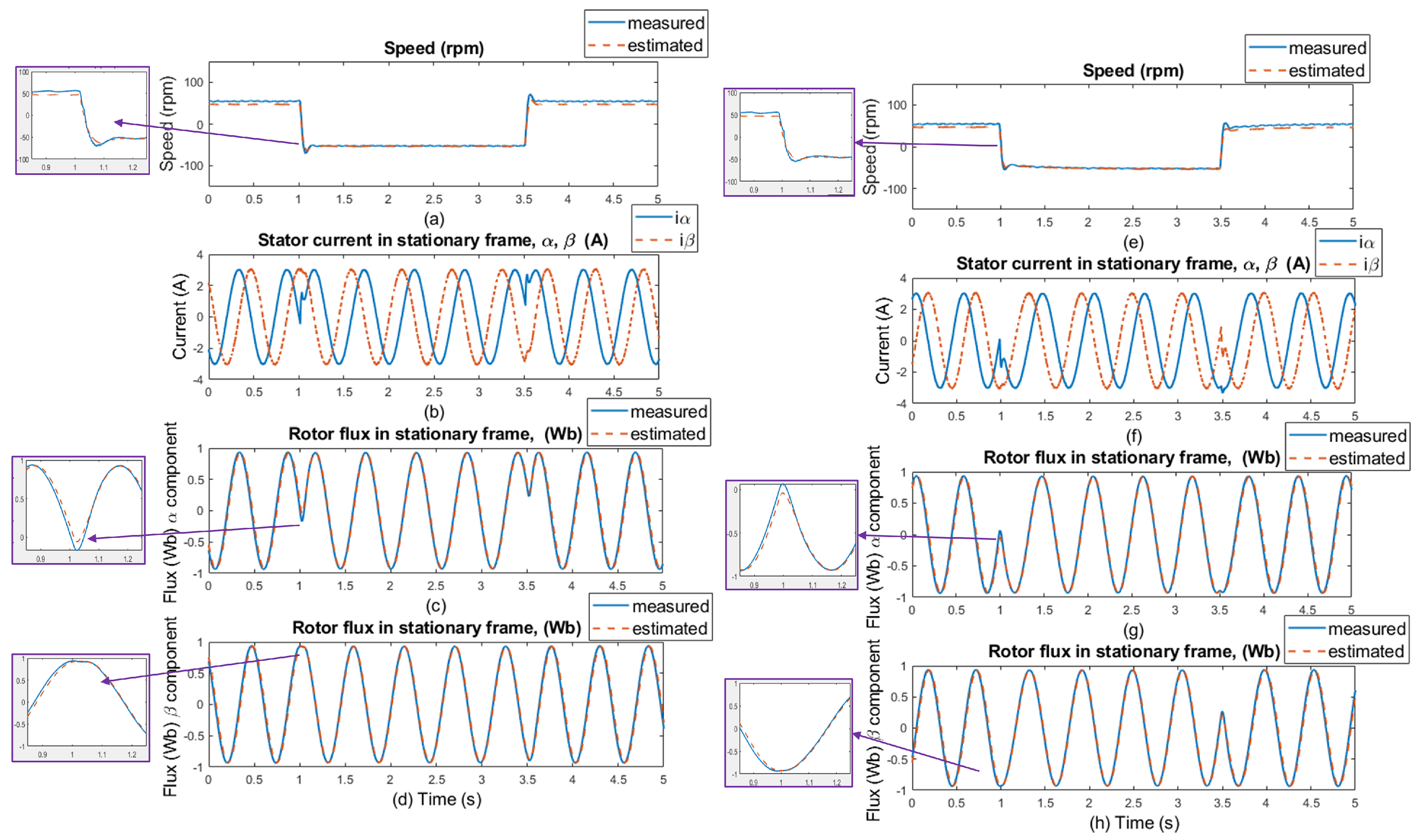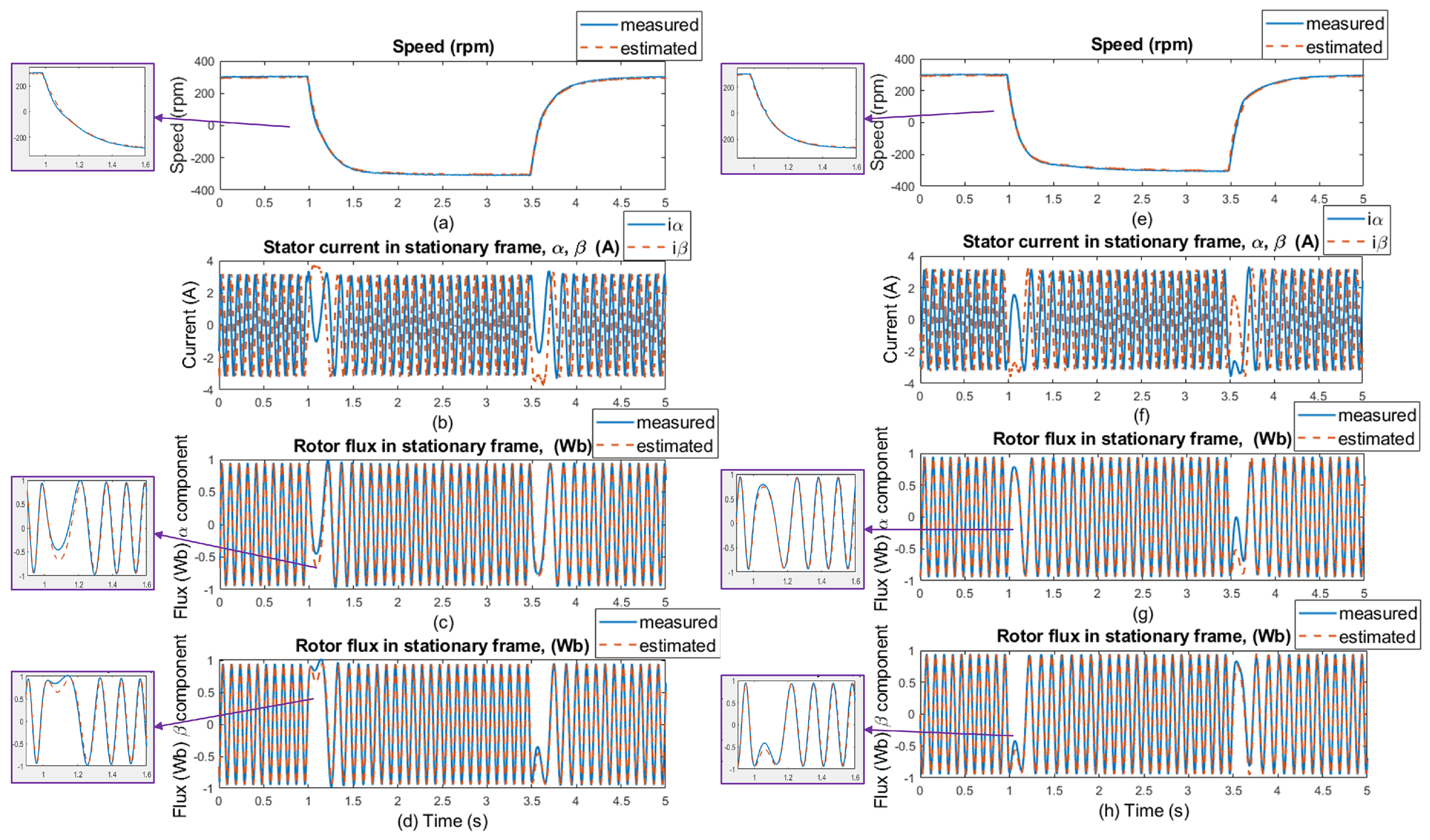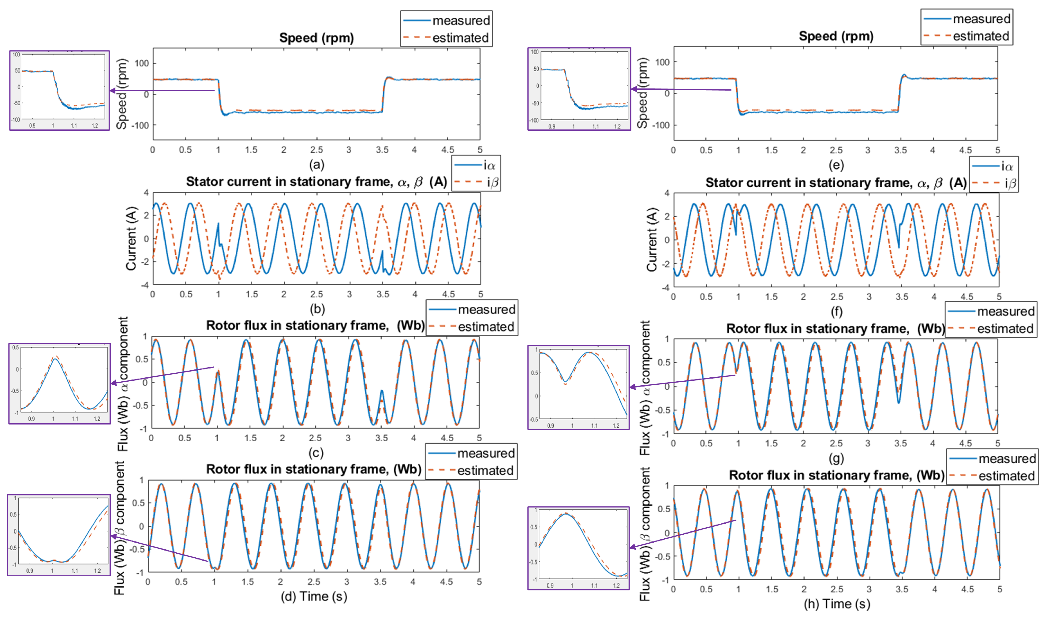 - Purti, S.J.; Kumar, R.; Das, S. Performance assessment of rotor flux and reactive power based MRAS for speed sensorless induction motor drive in a common test rig. In Proceedings of the 2015 International Conference on Computer, Communication and Control (IC4), Indore, India, 10–12 September 2015; pp. 1–7. [Google Scholar] [CrossRef]