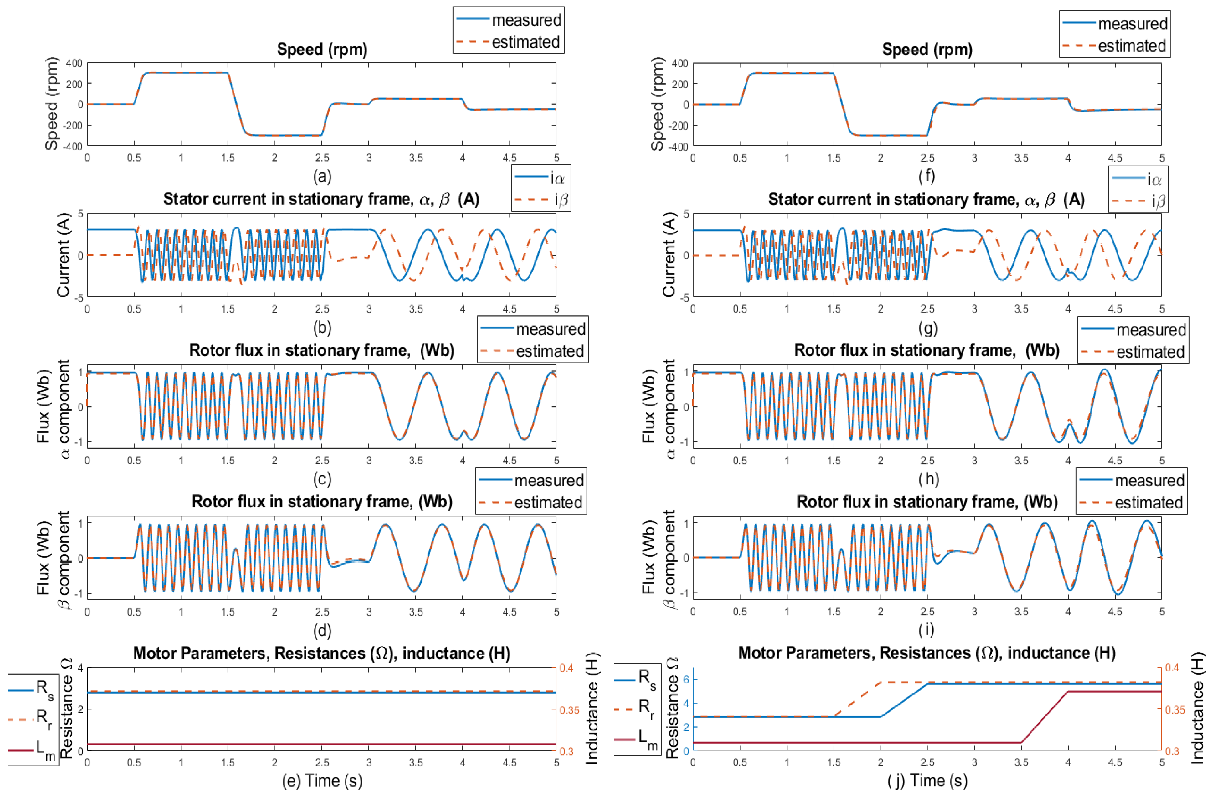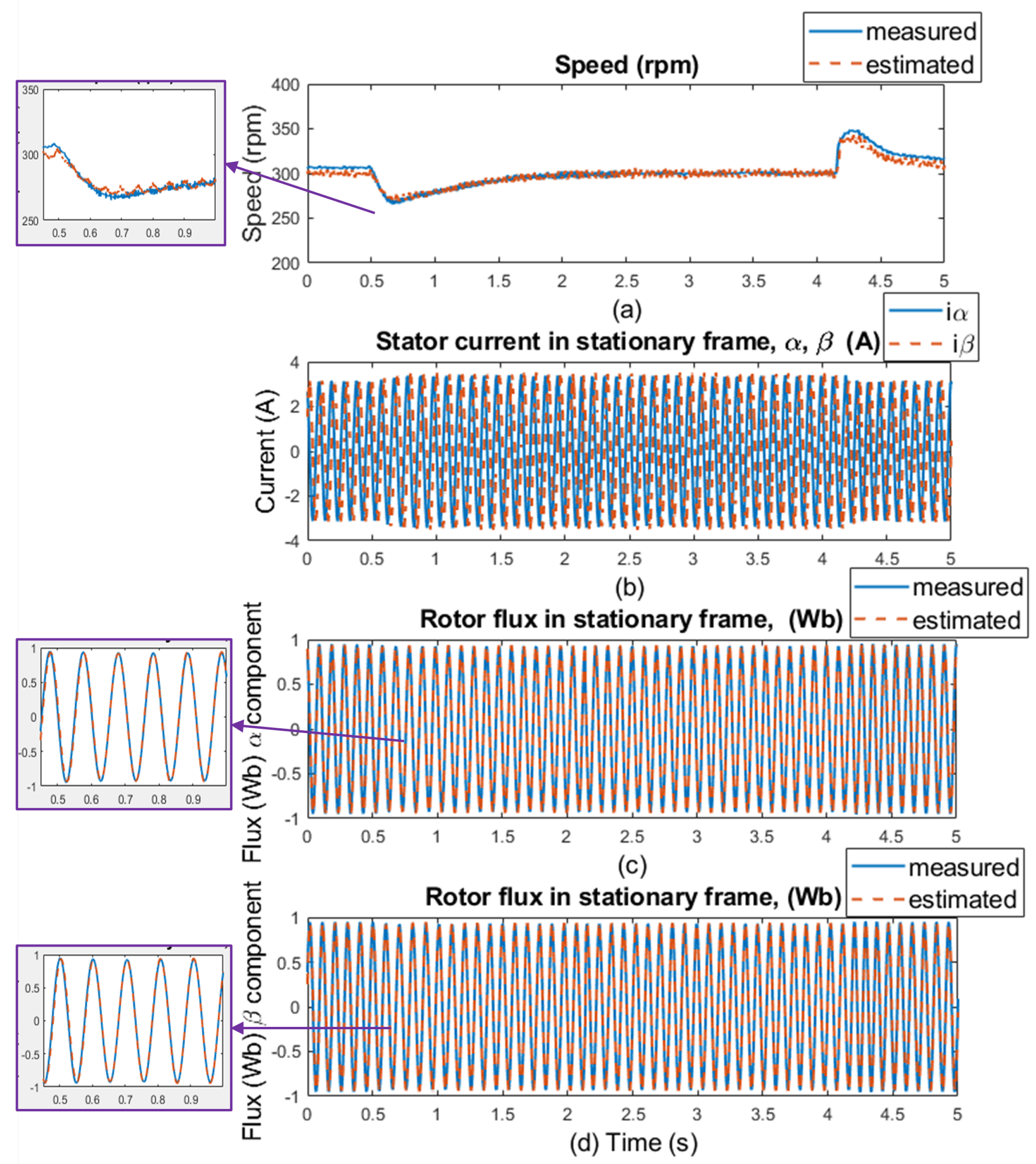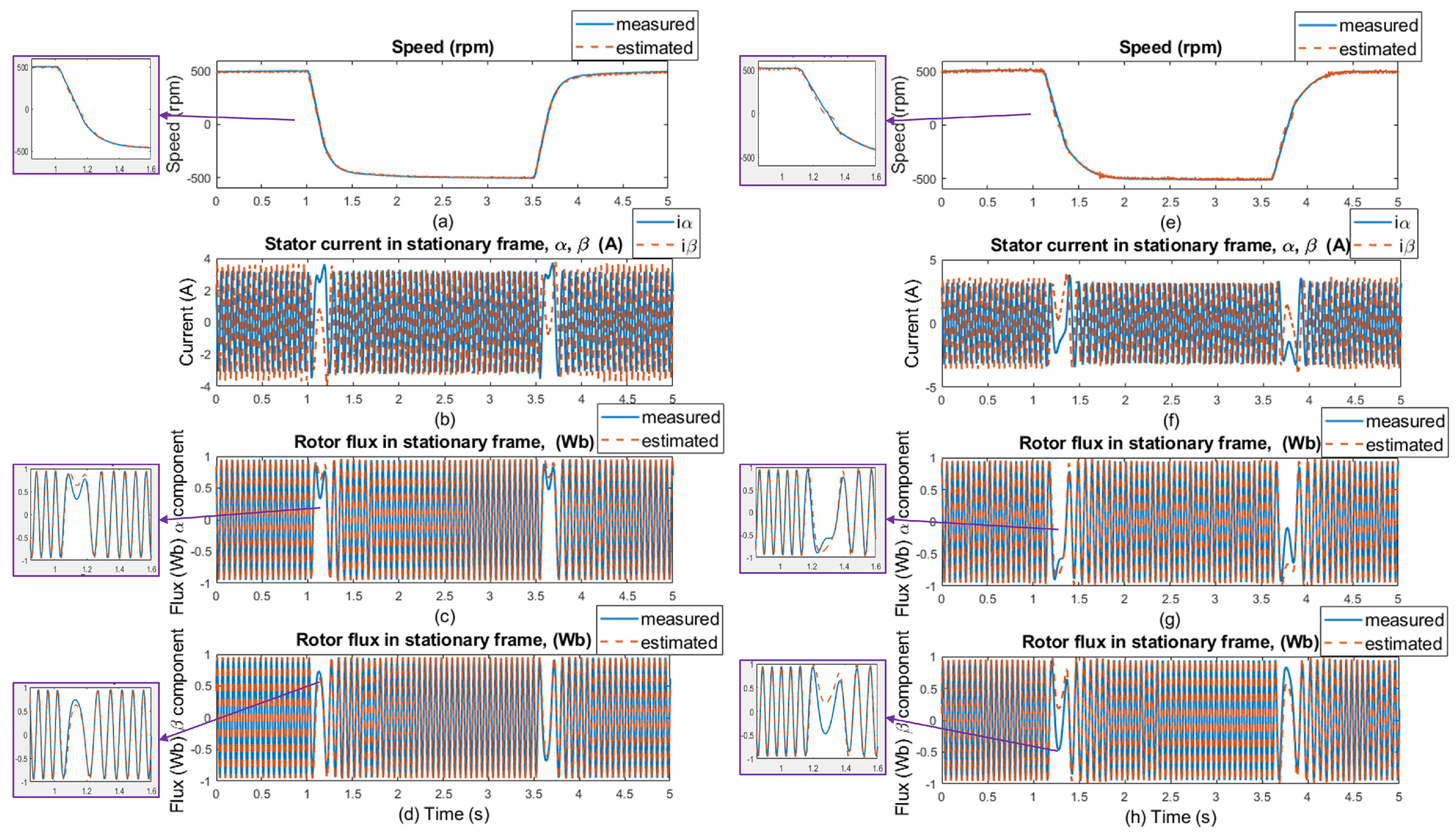 - Purti, S.J.; Kumar, R.; Das, S. Performance assessment of rotor flux and reactive power based MRAS for speed sensorless induction motor drive in a common test rig. In Proceedings of the 2015 International Conference on Computer, Communication and Control (IC4), Indore, India, 10–12 September 2015; pp. 1–7. [Google Scholar] [CrossRef]