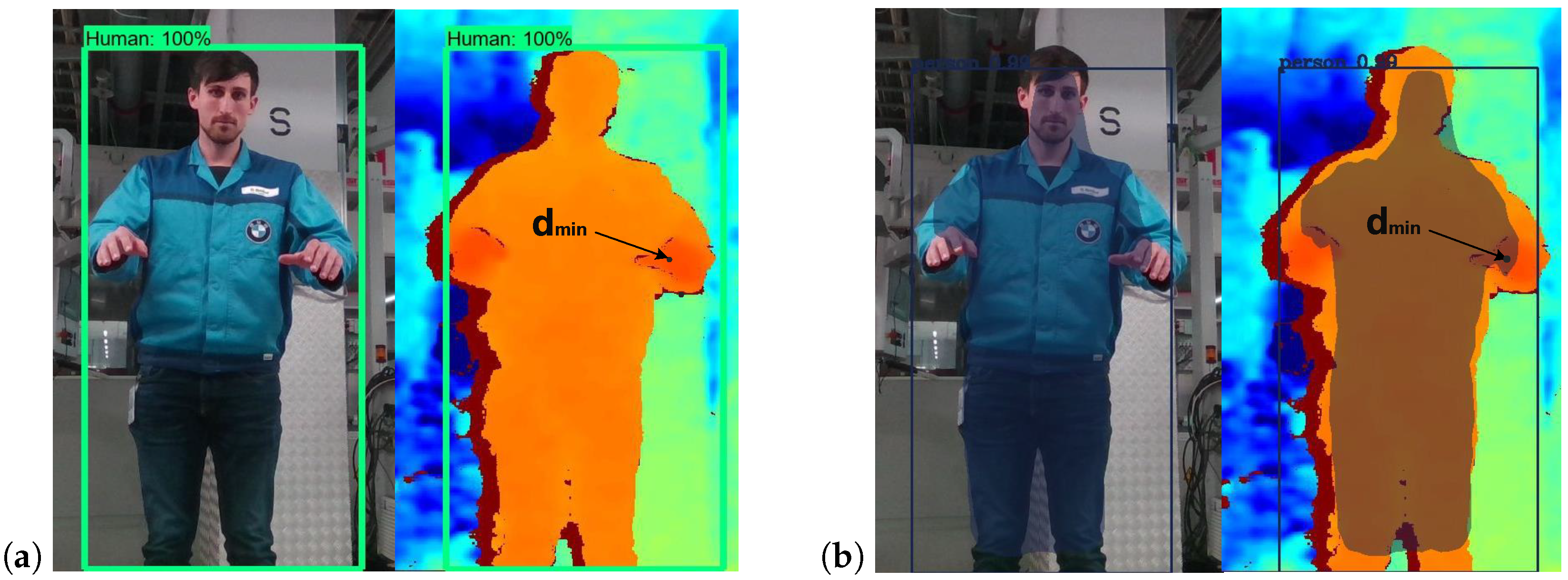 For human body recognition and human body segmentation, the desired minimal separation distance is obtained by determining the body point within the bounding box or the human surrounding contour closest to the robot world coordinate origin (Figure 1).