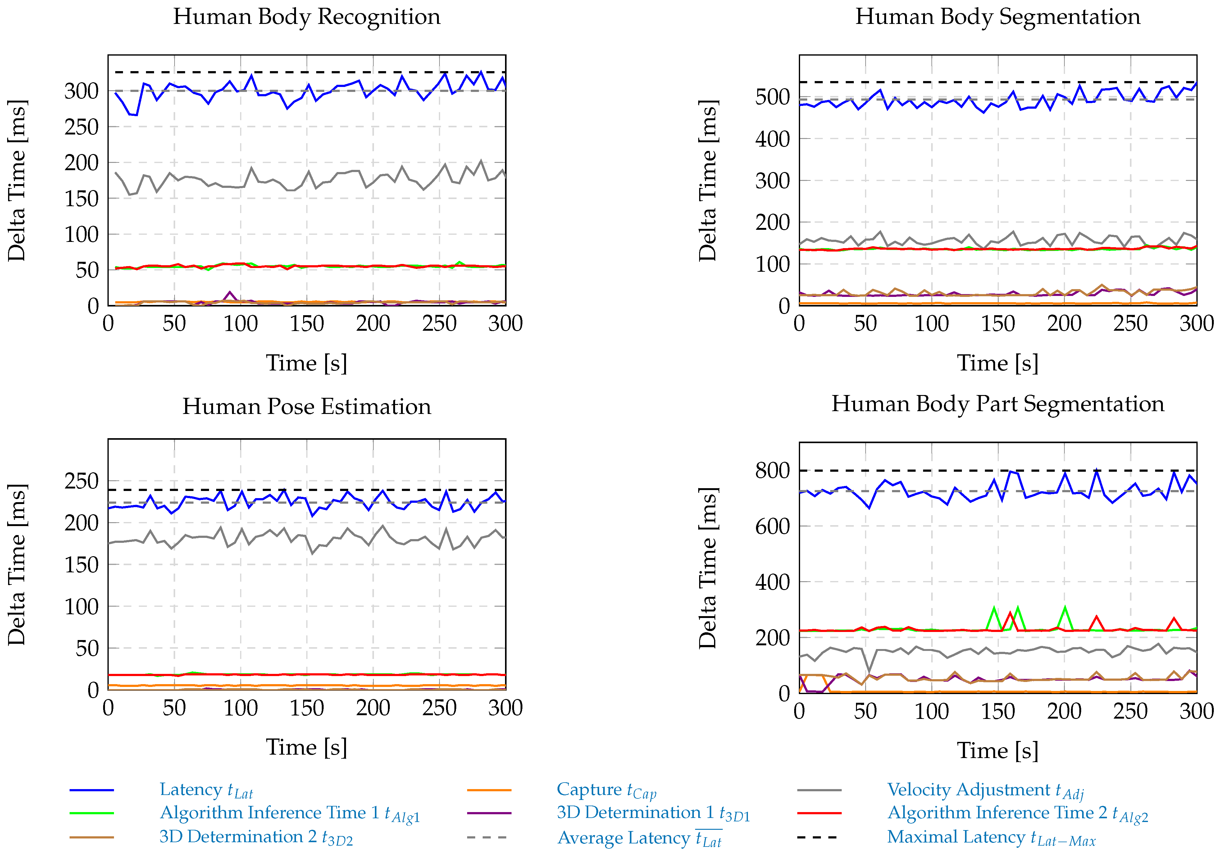 The latency measurements are triggered by the flashing of a light bulb that is initiated by the robot controller. Within the human sensing node, at first the illumination of the light bulb is checked before human body information is extracted from the RGB-D input data. Each time a light bulb flash is registered, the robot velocity is reduced to the minimum level allowed. The maximum latency levels are observed when the light bulb flash is initiated directly after an RGB-image has been captured; i.e., in this case most processing steps are carried out twice. After the robot has reached the desired velocity limit, the latency measurement is stopped. For each of the algorithms analyzed, the latency measurements are carried out for 300 s in order to determine a relative estimate of the maximum latency levels t L a t M a x occurring. Ultimately, the latency is determined by the following factors: the image-capturing time t C a p , the inference time t A l g of the algorithm, the spatial information extraction time t 3 D . and the robot velocity adjustment time t A d j . An overview of the obtained algorithm-specific latencies is given in Figure 3.
