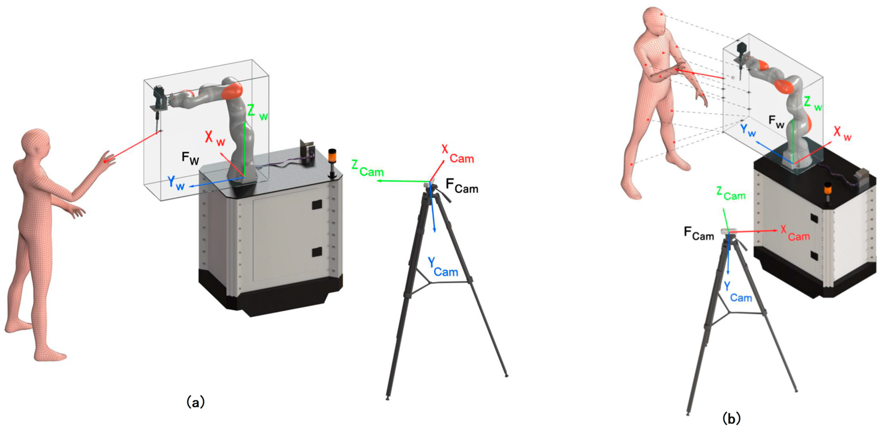 Since the extracted spatial body information is generally related to the camera coordinate frame F C a m , extrinsic parameters are applied in order to determine minimal separation distances with regard to the robot world coordinate frame F w .