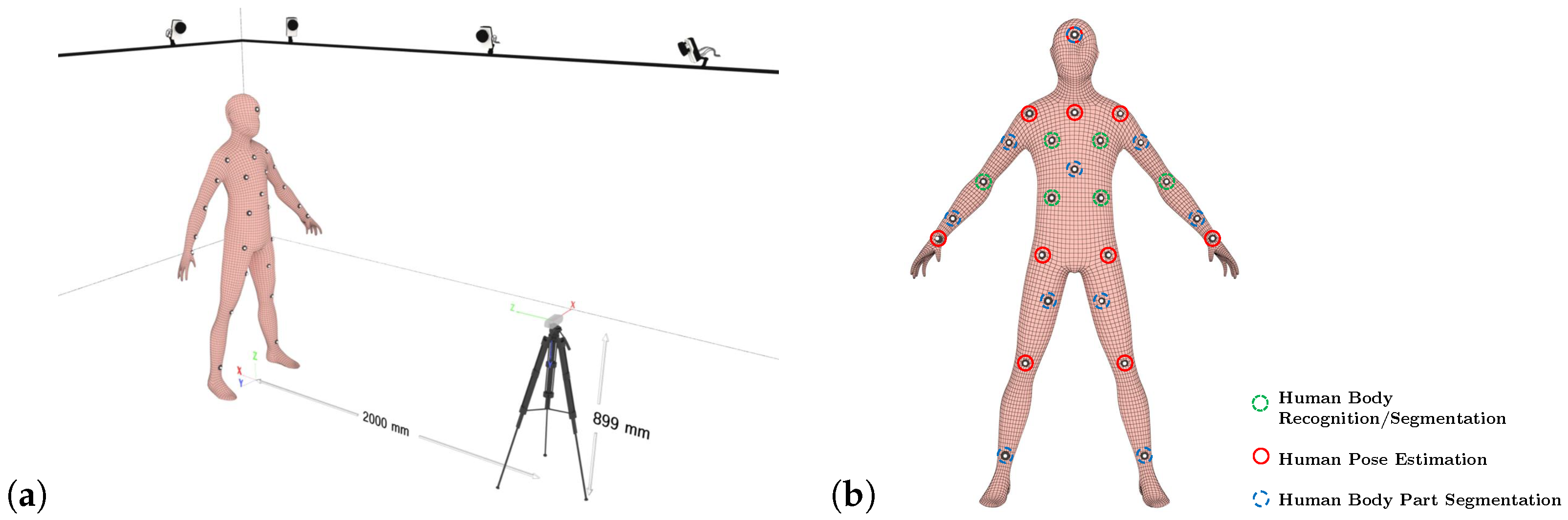 Figure 5. (a) Experimental setup for data acquisition. (b) Position of markers and indications of whether a marker is used for human pose estimation, human body part segmentation, or only for human-body-related accuracy validation. All of the markers chosen for human pose estimation and human body part segmentation were also considered for human-body-related measurements.