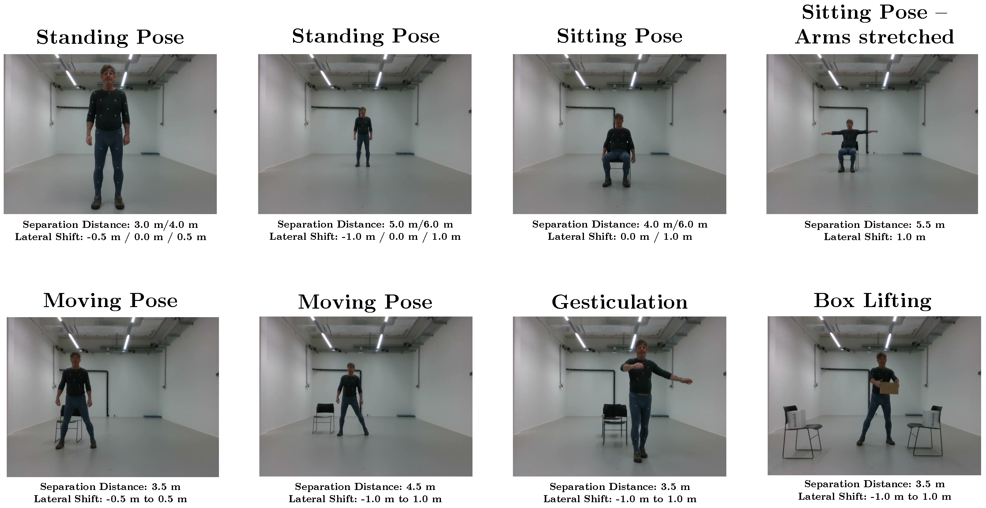In addition to algorithm-specific latency, the spatial position prediction uncertainty Z d constitutes a major factor influencing the required minimal separation distance. To quantify the individual error characteristics of the evaluated deep learning approaches, the spatial predictions produced by each algorithm were compared with ground-truth measurements obtained from a marker-based motion capture system. The deviation of the algorithm predictions were compared with 25 different markers that were attached to a human subject. Prior to data collection, all markers were placed according to the initial estimates provided by the respective models. Aside from a shared head marker, nine distinct marker positions were defined for the human pose estimation and human body part segmentation methods. For the human-body-centric approaches, these markers were also considered, supplemented by four additional torso markers and two markers placed near the elbows to improve the extraction of torso and upper-limb poses. The complete set of marker positions and their assignment to the respective methods are illustrated in Figure 5. Measurements were conducted for multiple static postures and a range of dynamic movements. An overview of all tested motion scenarios is provided in Figure 6. Each measurement was carried out for 3 min, ultimately corresponding to 1000 data samples acquired per measurement and body part.