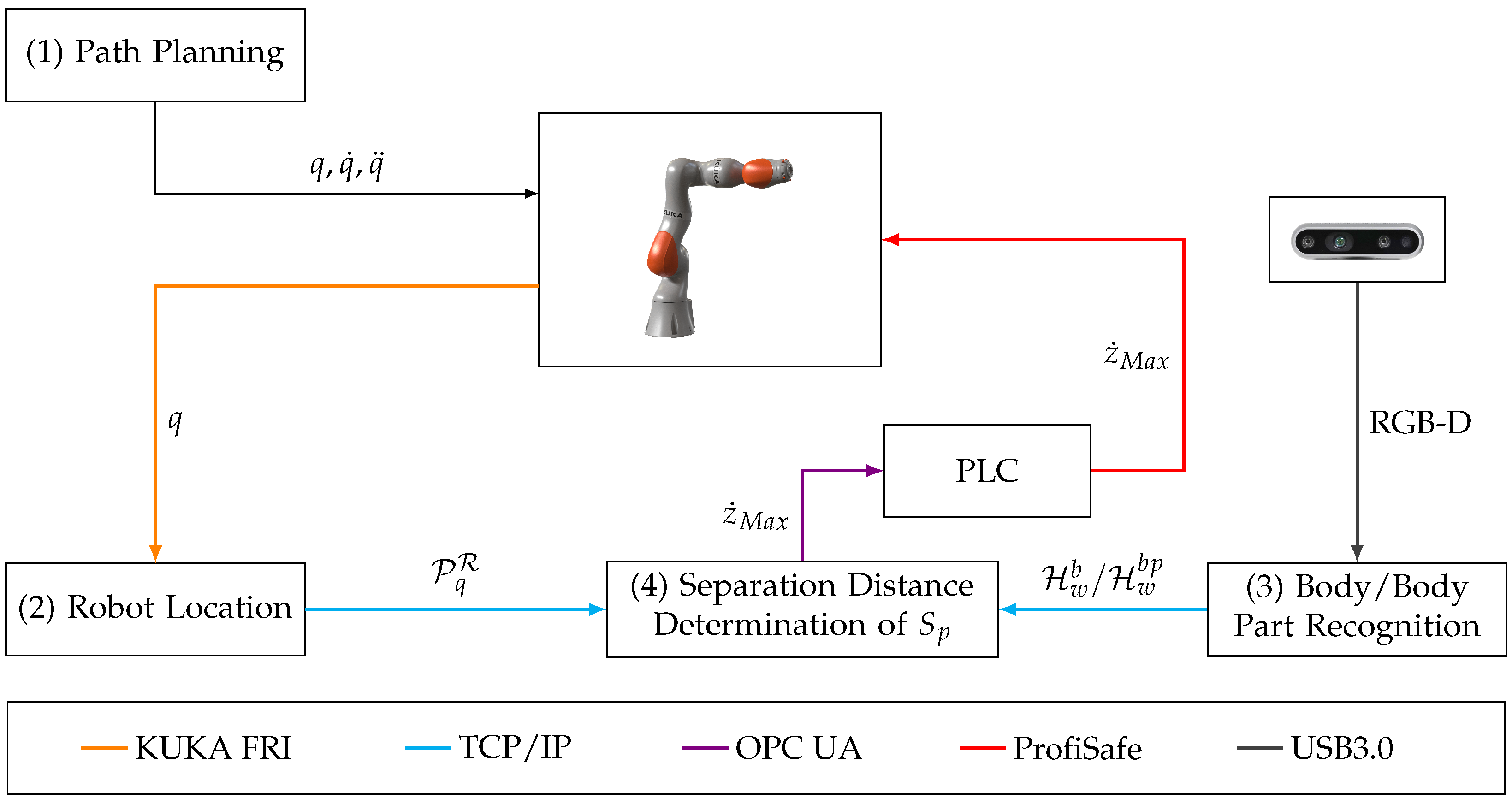 57. Bricher, D.; Müller, A. Analysis of Different Human Body Recognition Methods and Latency Determination for a Vision-based Human-robot Safety Framework According to ISO/TS 15066. In Proceedings of the 17th International Conference on Informatics in Control, Automation and Robotics, ICINCO 2020, Paris, France, 7–9 July 2020. [Google Scholar] [CrossRef]