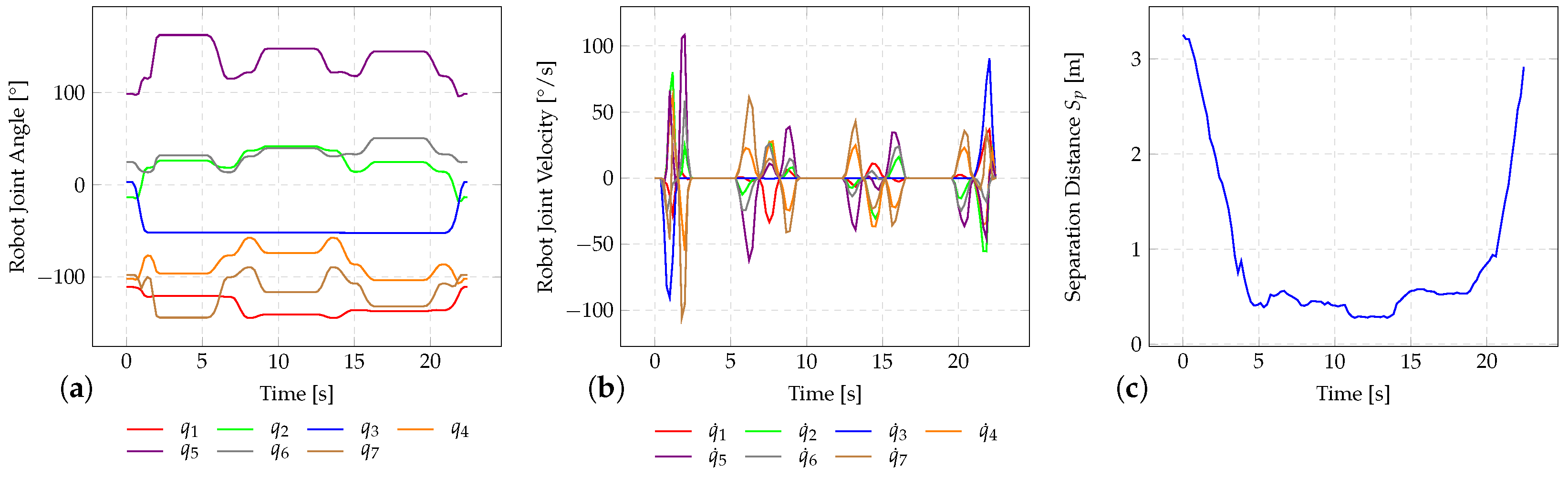 Figure 9. Plotted time evolution of (a) robot joint angles, (b) robot joint velocities. and (c) separation distance S p between the human and robot for the investigated screwing application while the human body part segmentation within the HRSF is applied.