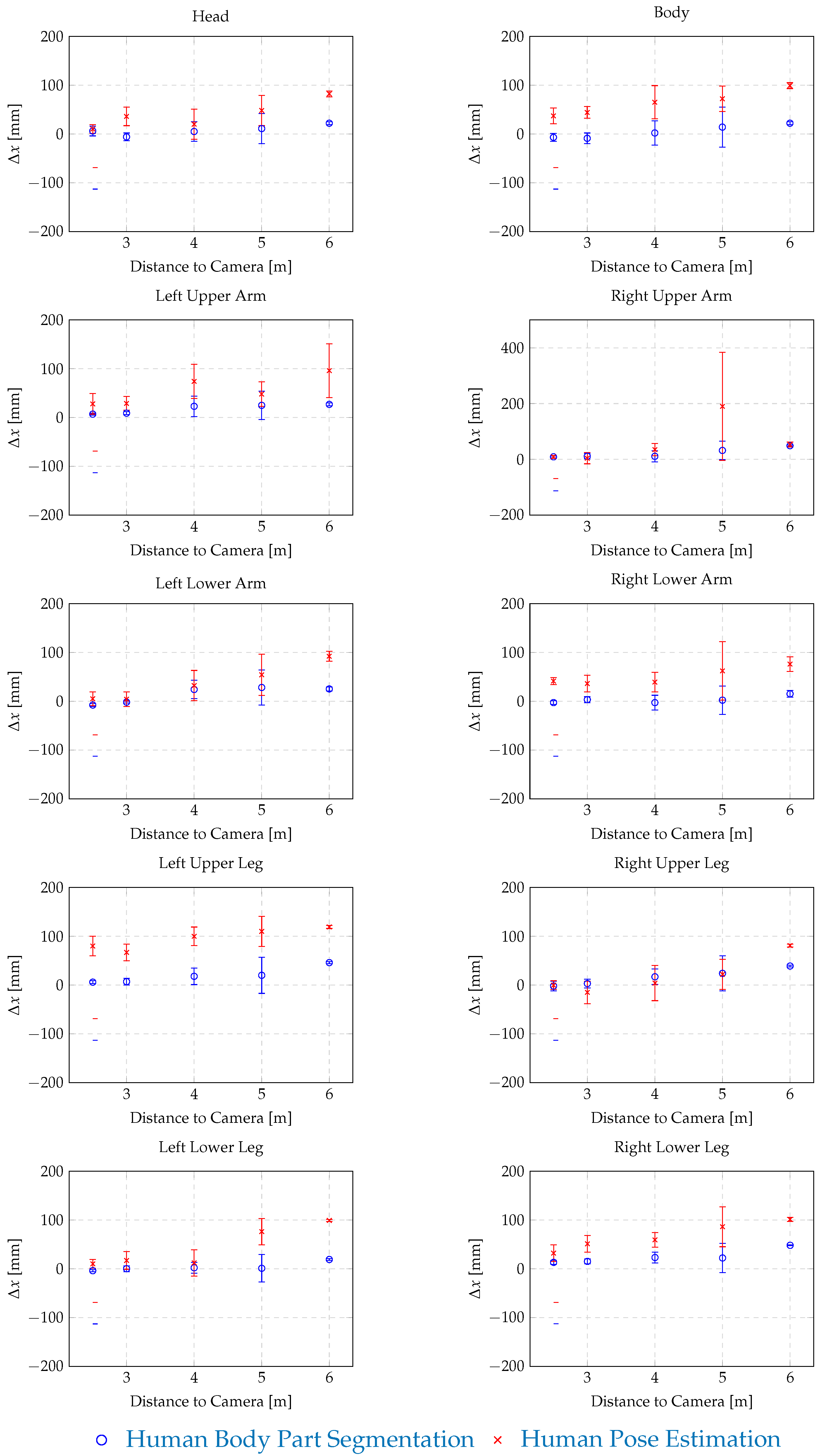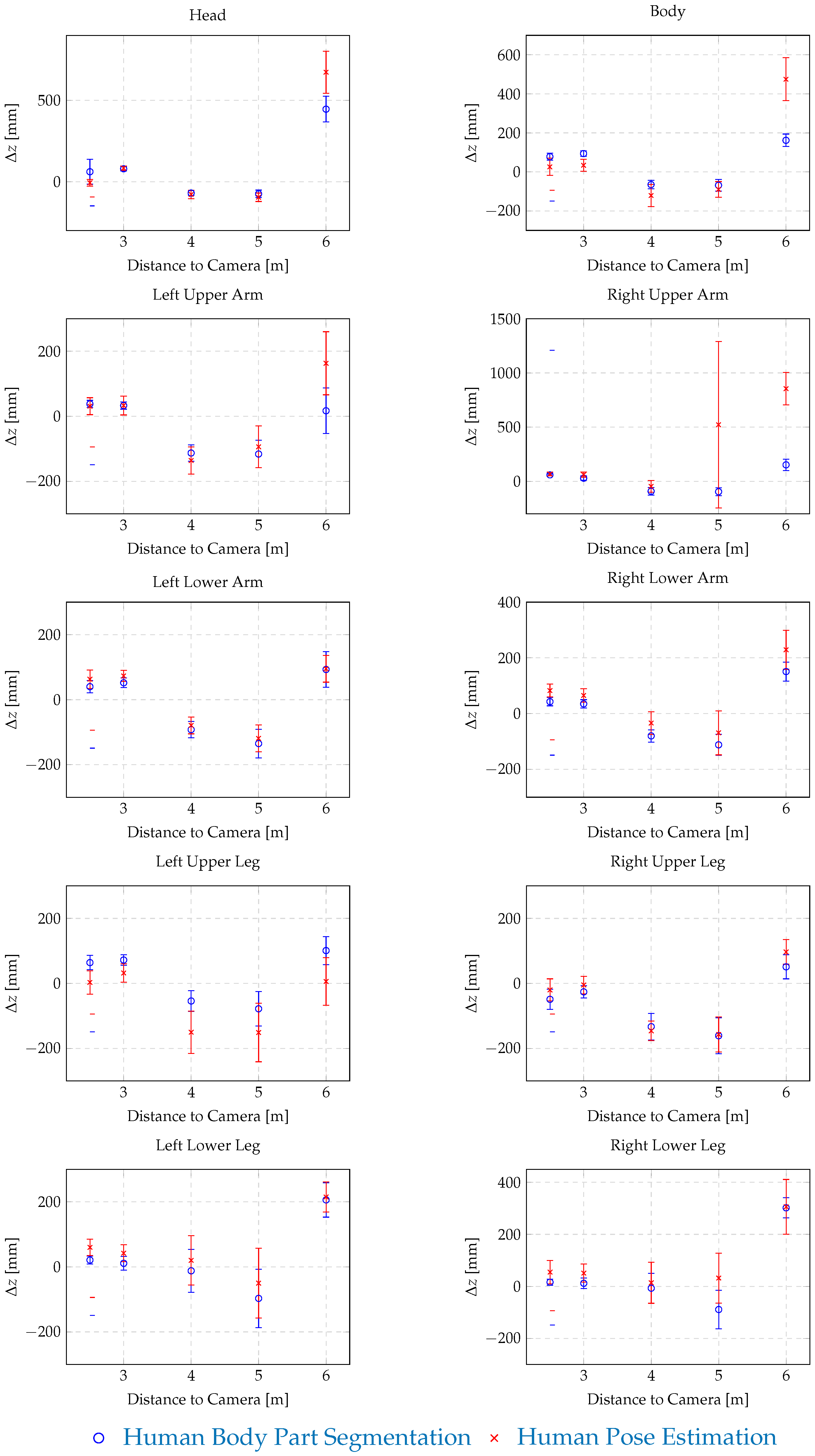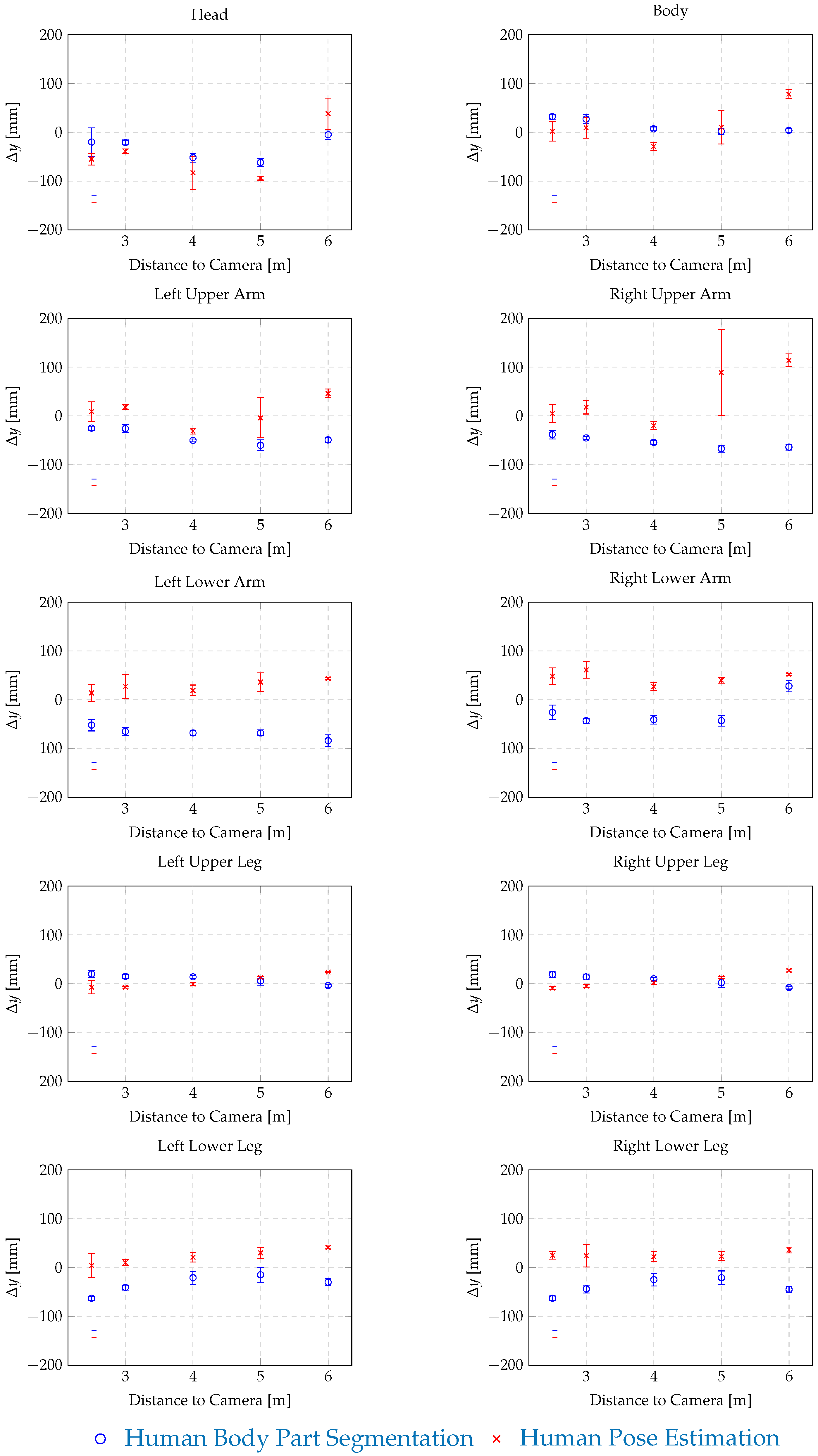 In contrast to the analyzed human-body-related approaches, the results obtained for human-body-part-related techniques indicate a more precise prediction behavior. Even though at separation distances below 4 m, the obtained depth tolerance level of 15 cm was slightly worse, compared to the deviations observed for human body related methods, the lateral error range was significantly better by reaching 7 cm for most body parts analyzed. At higher distances discrepancies mainly appear for body extremities, e.g., the right upper arm. Particularly, at distances of 6 m, the depth estimation error exceeded levels of 0.5 m, which in turn suggests that an accurate depth resolution is no longer possible for particular body parts. In contrast, the lateral deviations increased only slightly with the distance to the camera, which indicates that the most limiting factor for an accurate spatial body part prediction is the depth sensor resolution. Among the different static, sitting, and moving measurement scenarios, higher discrepancy levels were observed with increasing distances to the camera. Particularly, at distances of >5 m error, levels above 0.5 m would have to be considered. Overall, the results obtained for human body segmentation show a less fluctuating behavior compared to human body recognition.