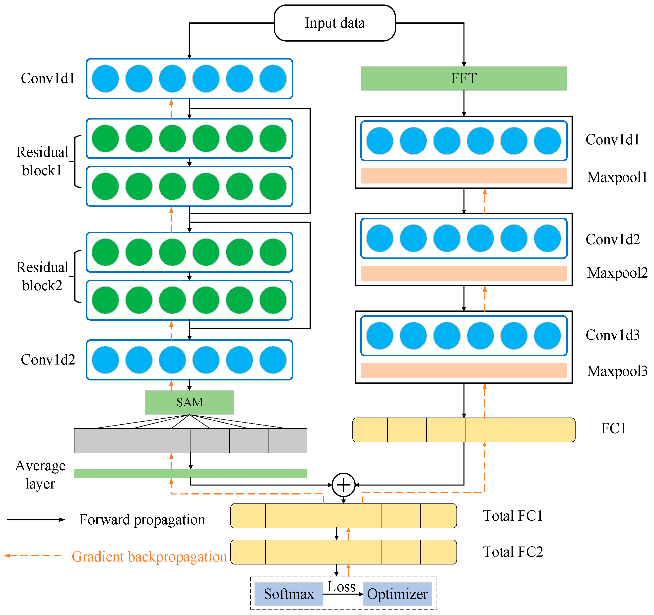 By combining the time domain and frequency domain feature extraction networks, we can obtain the feature set of the signal in both time and frequency domains. After merging the final feature layers and performing classification, the fault diagnosis results can be obtained. The last two layers of the networks in