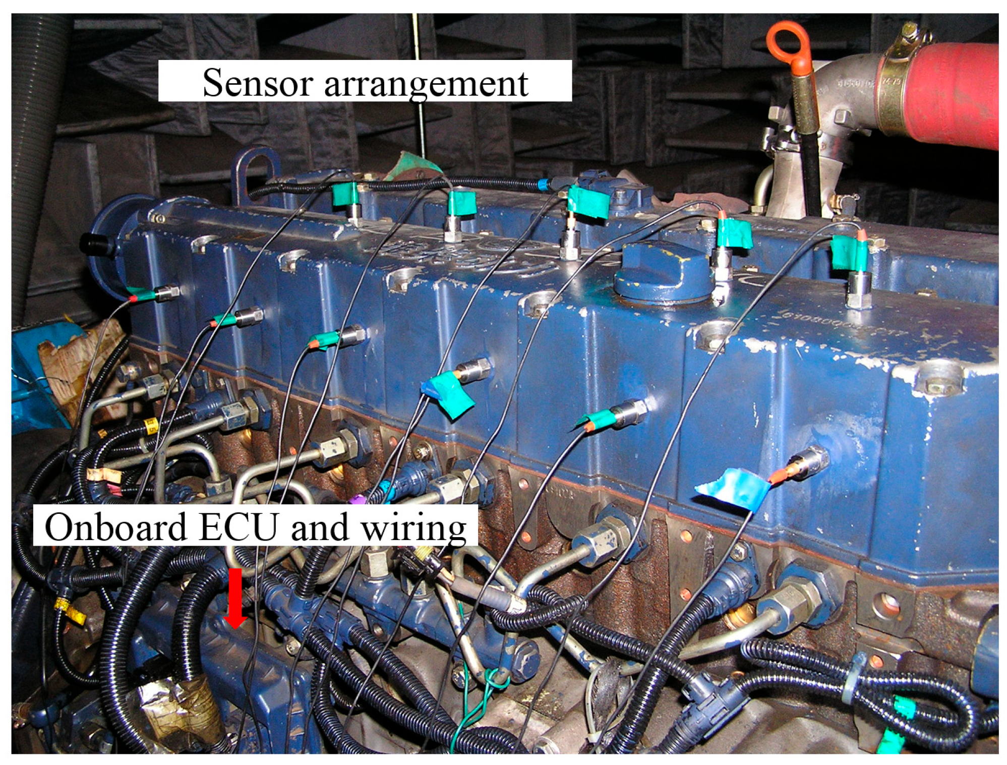 Figure 5. The signal acquisition system comprises sensors, wiring harnesses, data acquisition frontends, and a test computer. Vibration acceleration was measured using PCB’s 621B40 type sensor (Depew, NY, USA), and engine speed was tested using the SPSE-115 type photoelectric sensor from MONARCH Company (Medicine Hat, AB, Canada).